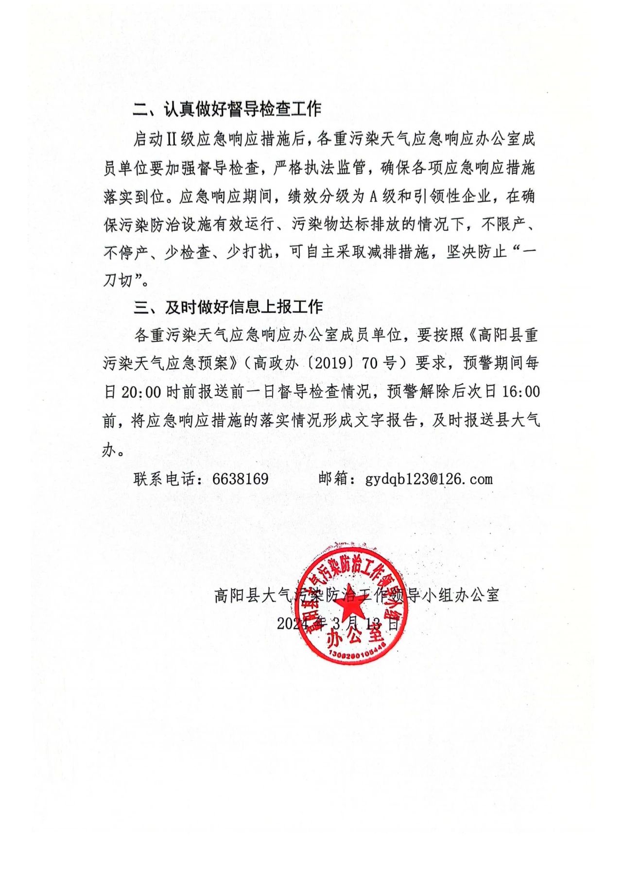 高阳县大气污染防治工作领导小组办公室关于启动重污染天气Ⅱ级应急响应措施的通知