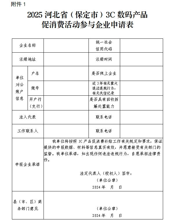 (一)2025河北省(保定市)3C数码产品促消费参与企业申请表(2024年已入围我市家电促消费活动的承办单位也需重新申报)。