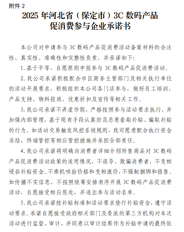 2.2025年河北省(保定市)3C数码产品促消费活动参与企业承诺书