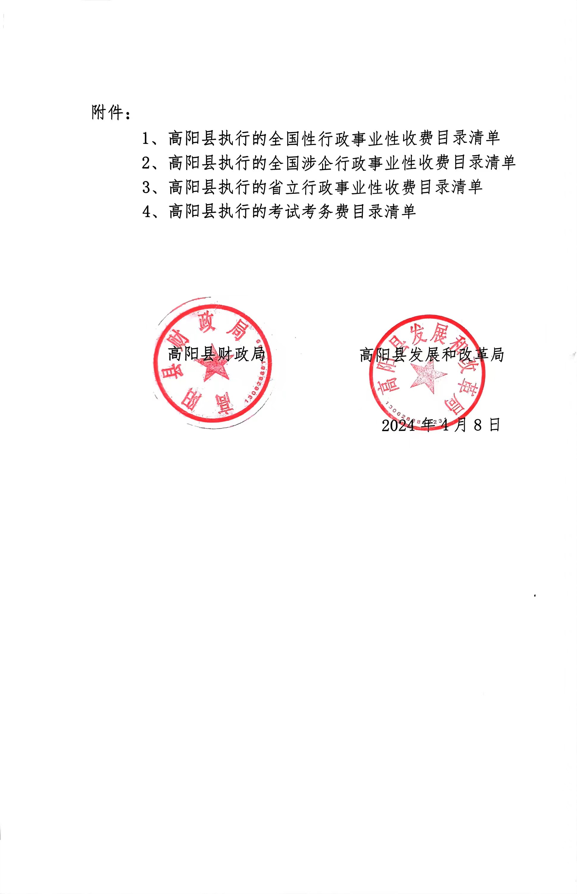 高阳县财政局高阳县发展和改革局关于发布2024年行政事业性收费目录的公告