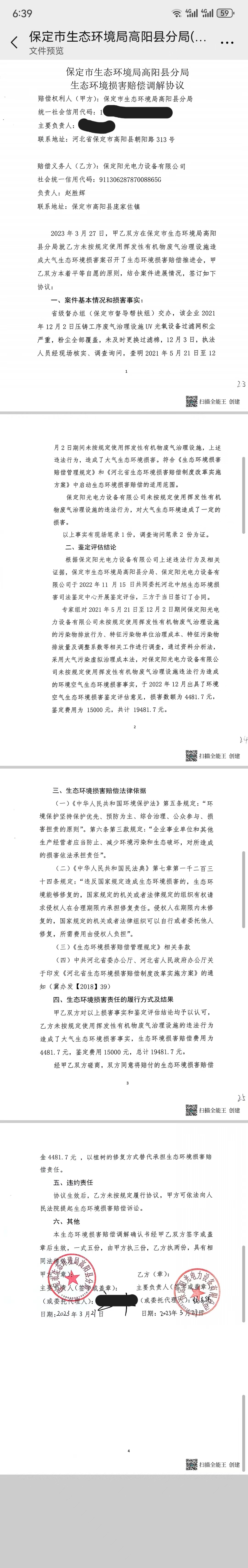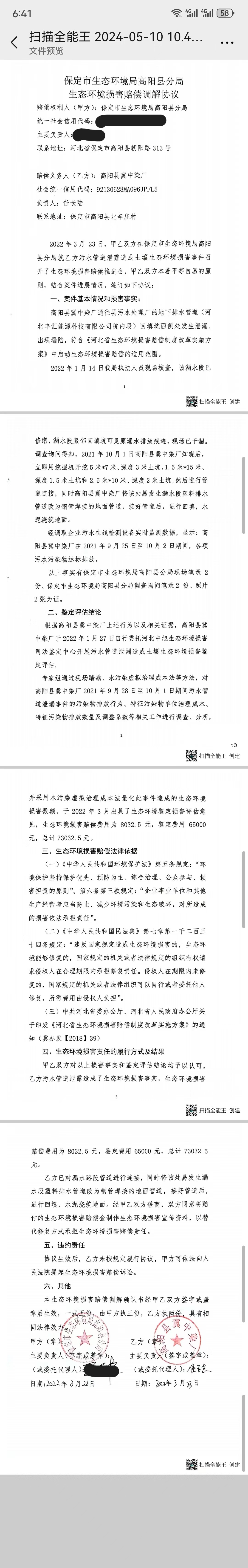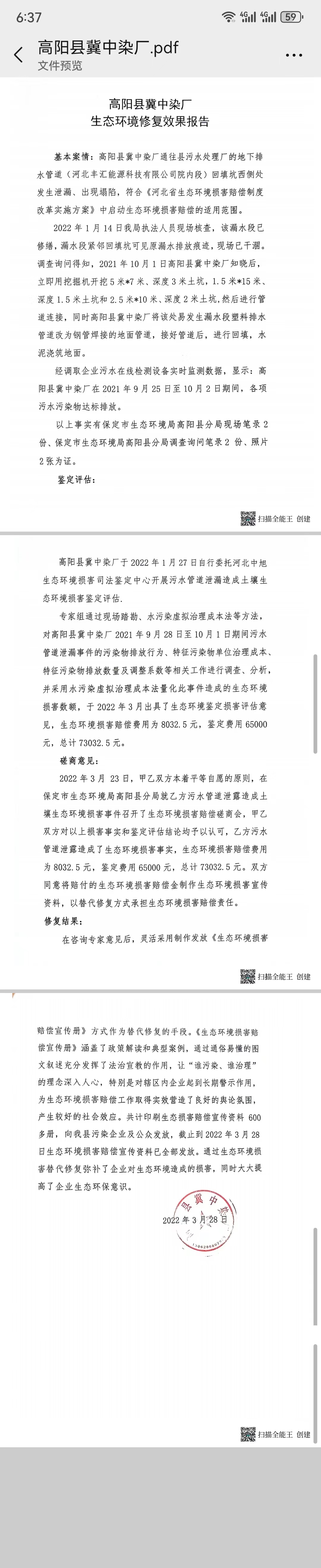 高阳县冀中染厂、保定阳光电力设备有限公司、高阳县益康染织有限责任公司生态环境损害赔偿协议及修复效果报告