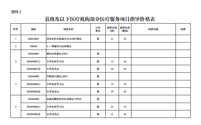 根据保定市医疗保障局 保定市卫生健康委员会《关于调整部分医疗服务项目价格的通知》(保医保〔2024〕47号)文件要求,按照冀医保函〔2024〕120号精神,调整修订部分检验类医疗服务项目指导价格,按价格管理权限制定了我市县级及以下医疗机构指导价格(见附件)。