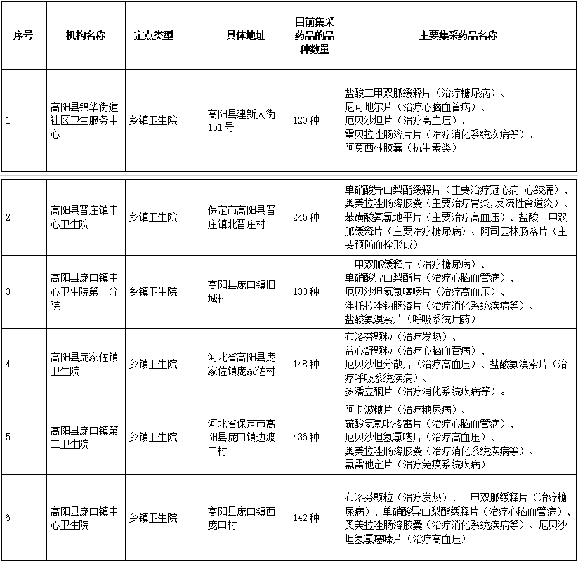 按照省市工作安排,自7月以来高阳县医保局积极响应促进集采药品进基层医疗机构、进民营医疗机构、进零售药店“三进”活动有关要求,持续扩大集采政策覆盖面,让广大群众在更多渠道,实现就近就便购买到质优价宜的集采药品,切实减轻参保群众用药负担。现将全县集采“三进”活动部分定点医药机构公布如下: