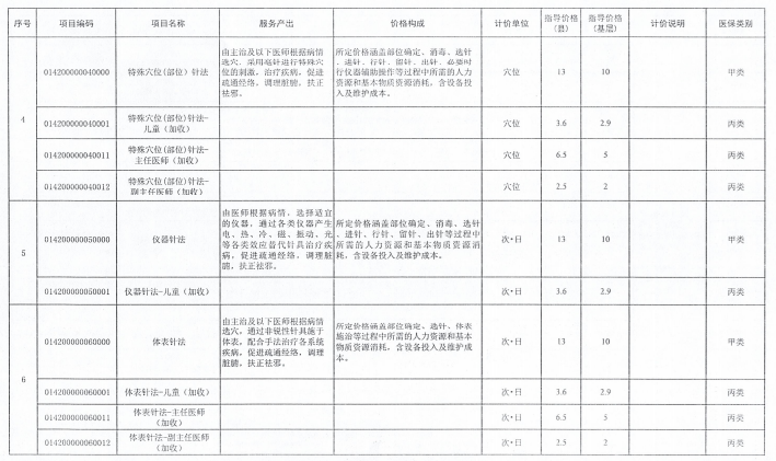 根据保定市医疗保障局 保定市卫生健康委员会《关于规范中医针法类医疗服务价格项目的通知》(保医保〔2025〕13号)文件要求,按照冀医保函〔2025〕13号精神,调整中医针法类医疗服务价格项目,并按价格管理权限制定我市县级及以下医疗机构指导价格(见附件);停用“馋针、锋钩针”等29项医疗服务价格项目(见附件)。