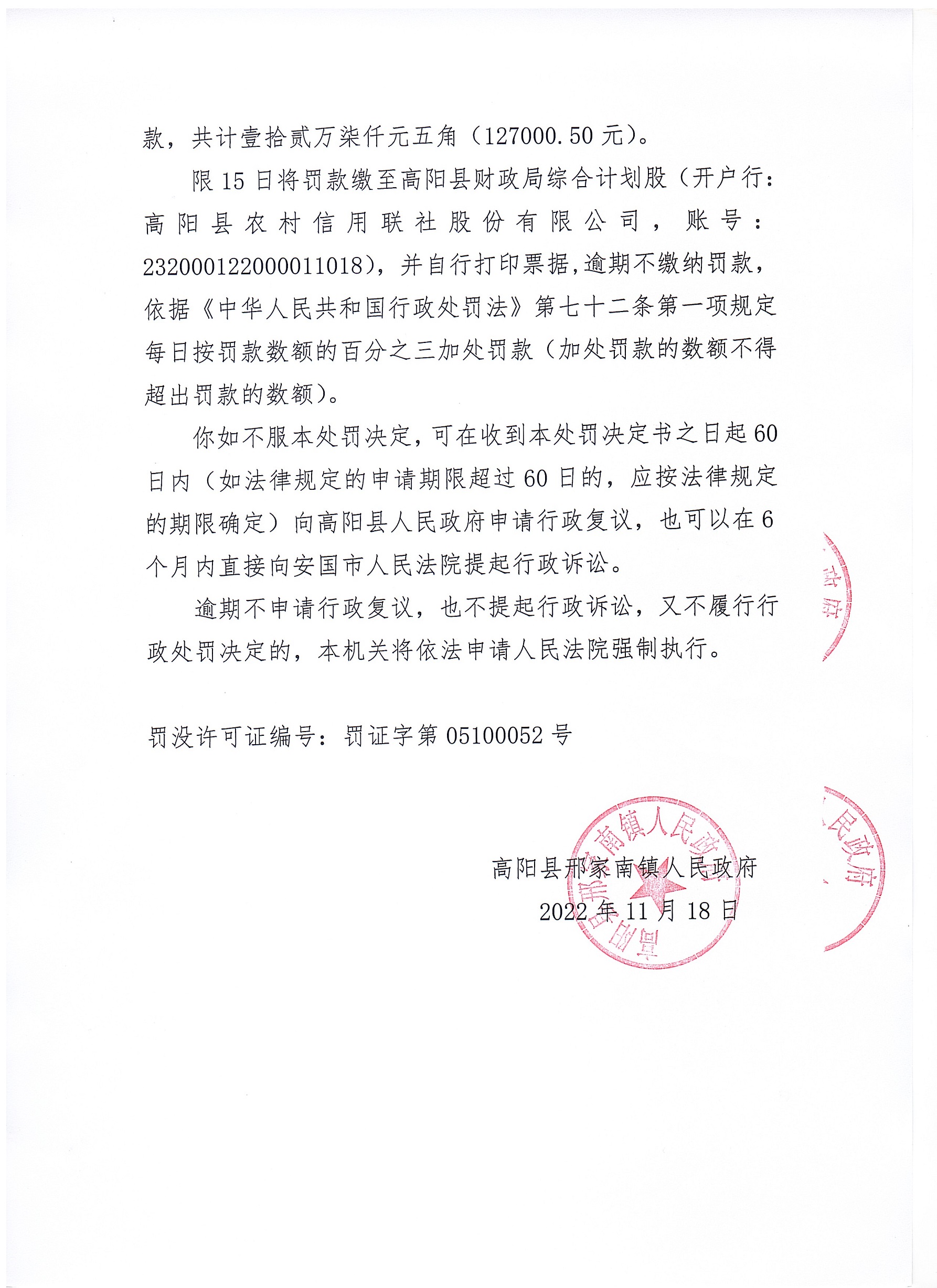 高阳县邢家南镇人民政府于2022年11月18日依法向赵慧送达《行政处罚决定书》高邢罚决字〔2022〕010号。