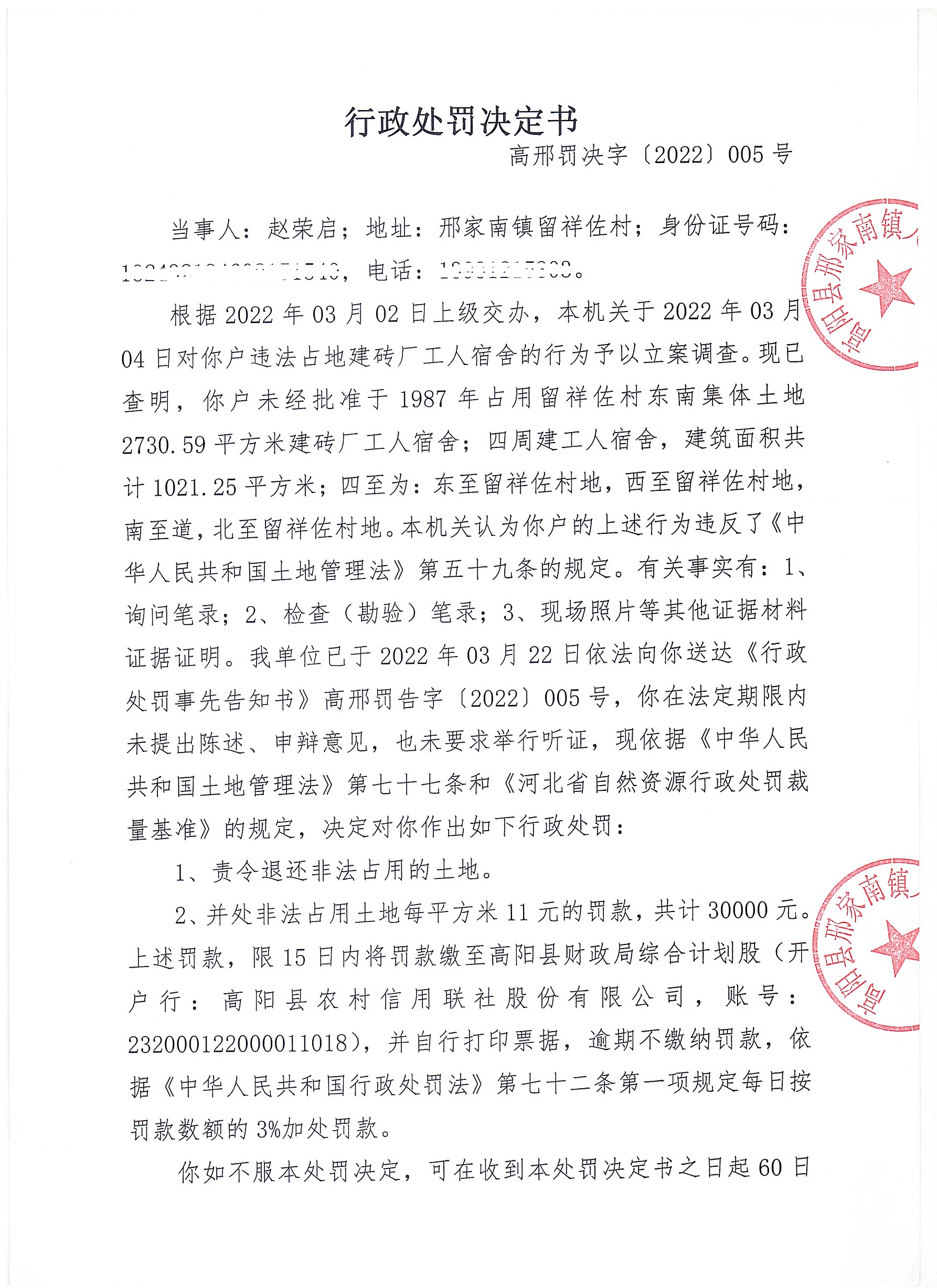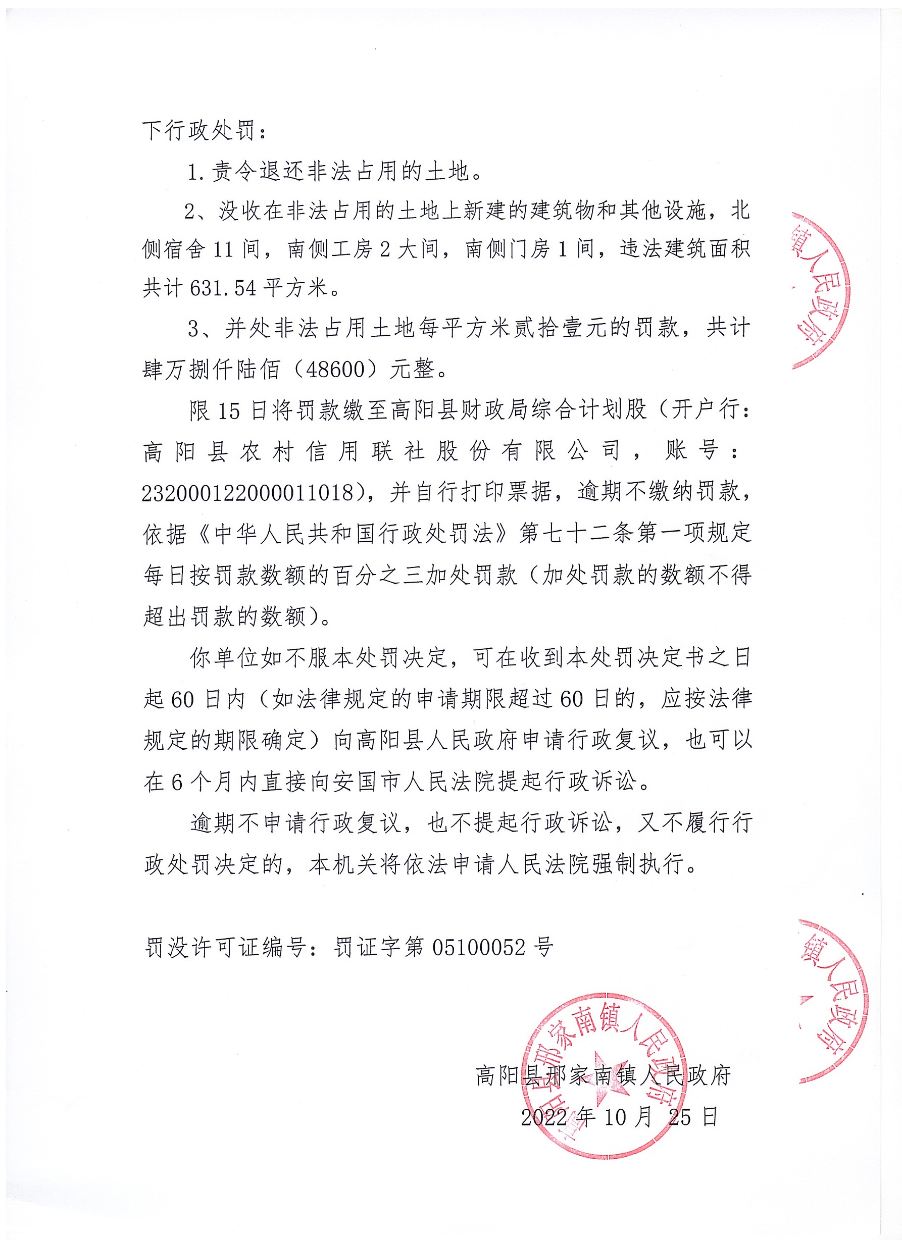 高阳县邢家南镇人民政府于2022年10月25日依法向高阳县荣仪毯业有限公司下达《行政处罚决定书》高邢罚决字〔2022〕015号。