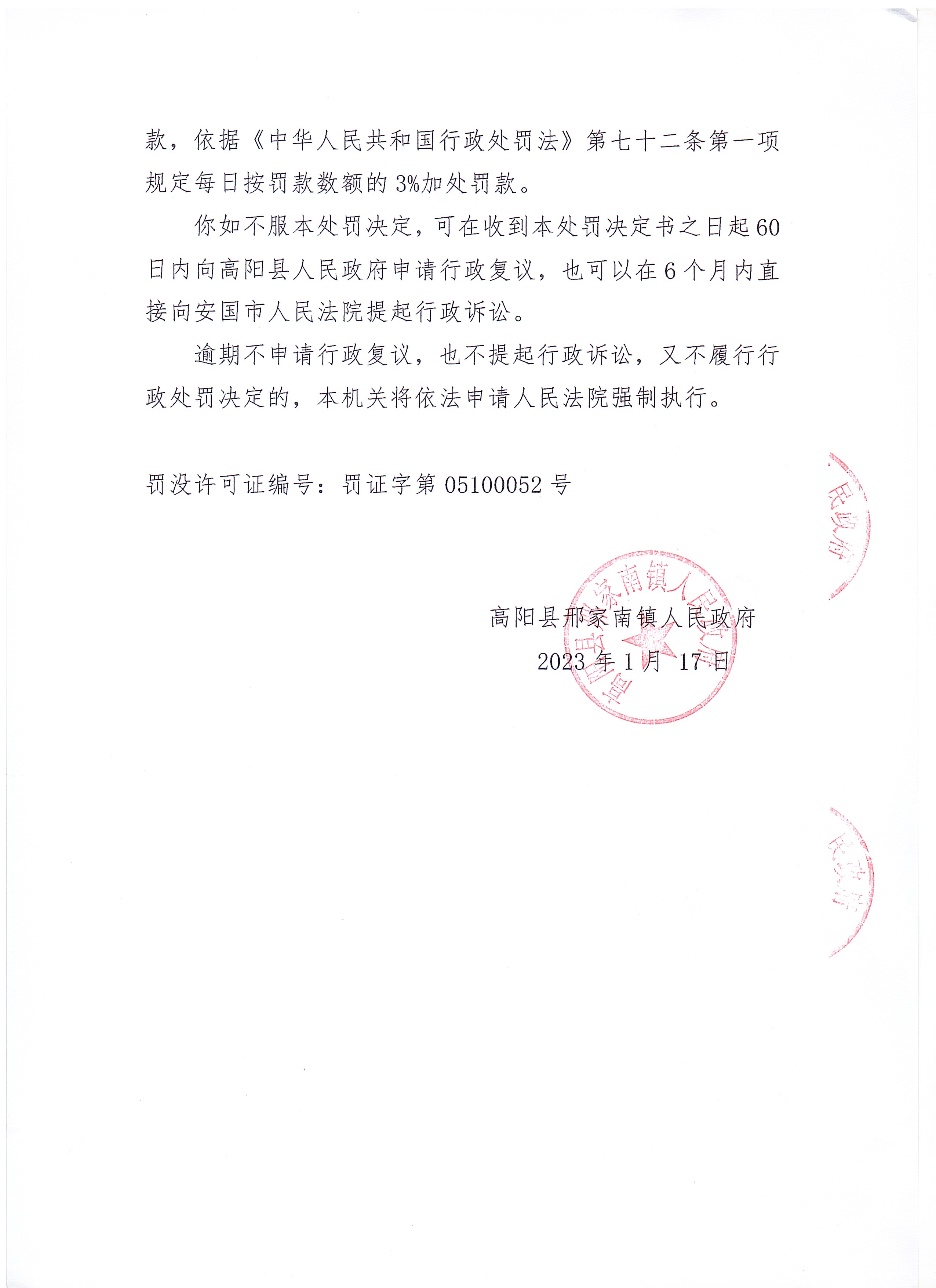 高阳县邢家南镇人民政府于2023年01月17日依法向刘二栋下达了《行政处罚决定书》高邢罚决字〔2022〕016号。