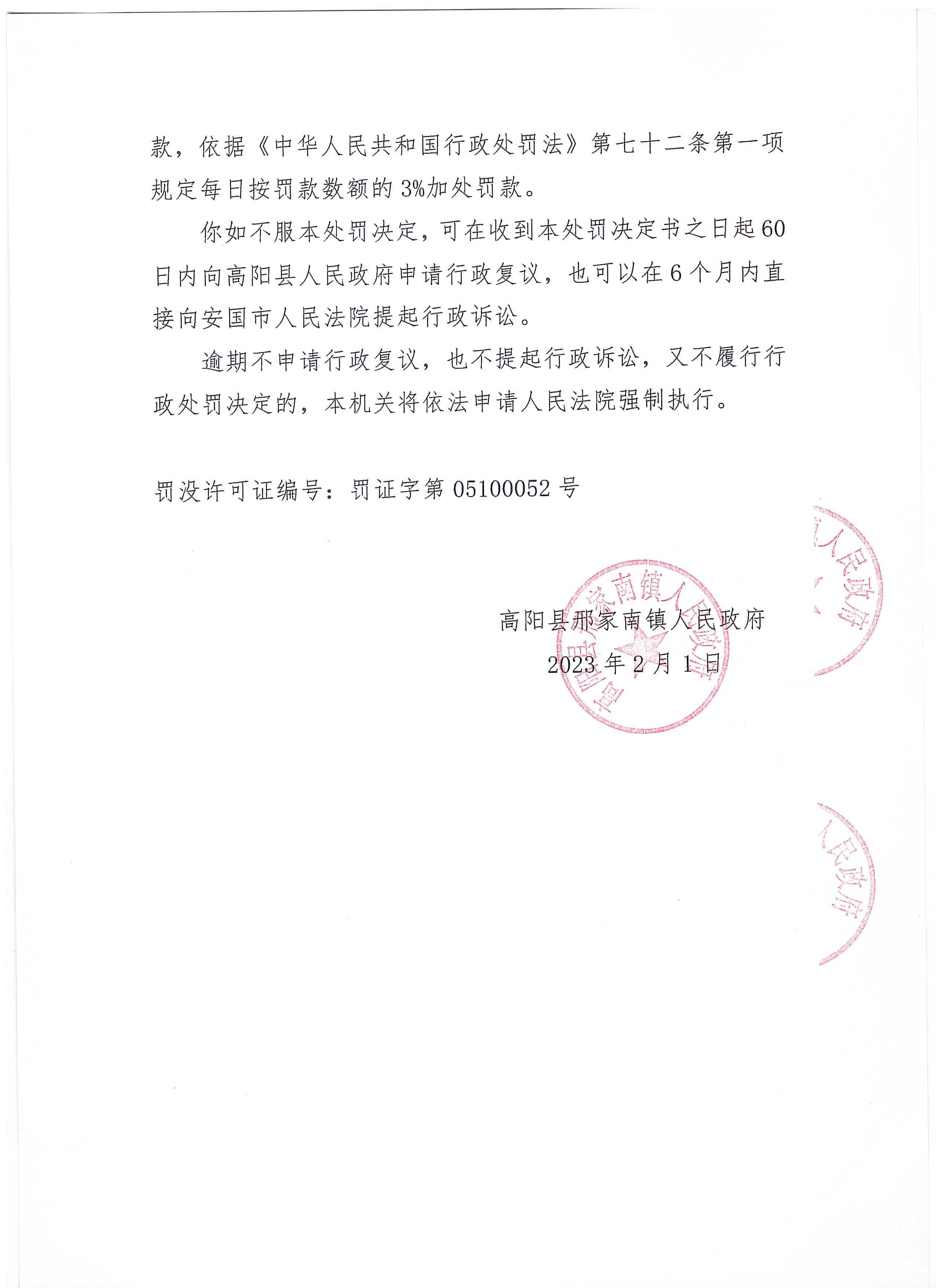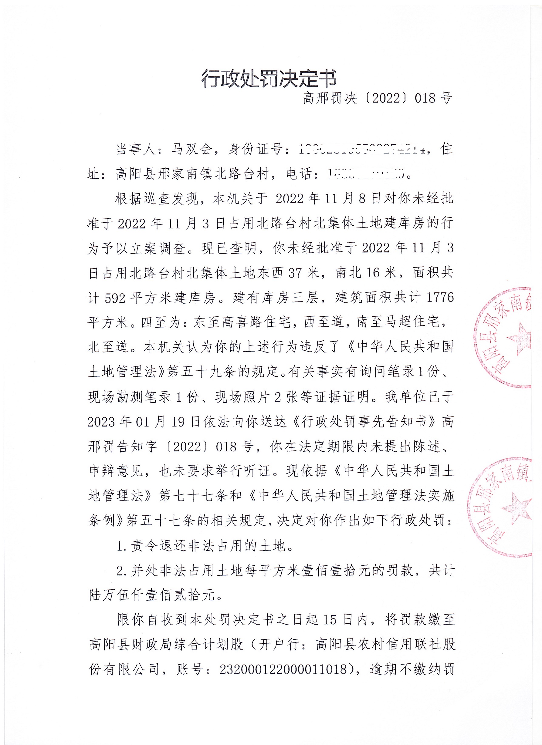 高阳县邢家南镇人民政府于2023年02月01日依法向马双会下达《行政处罚决定书》高邢罚决字〔2022〕018号.