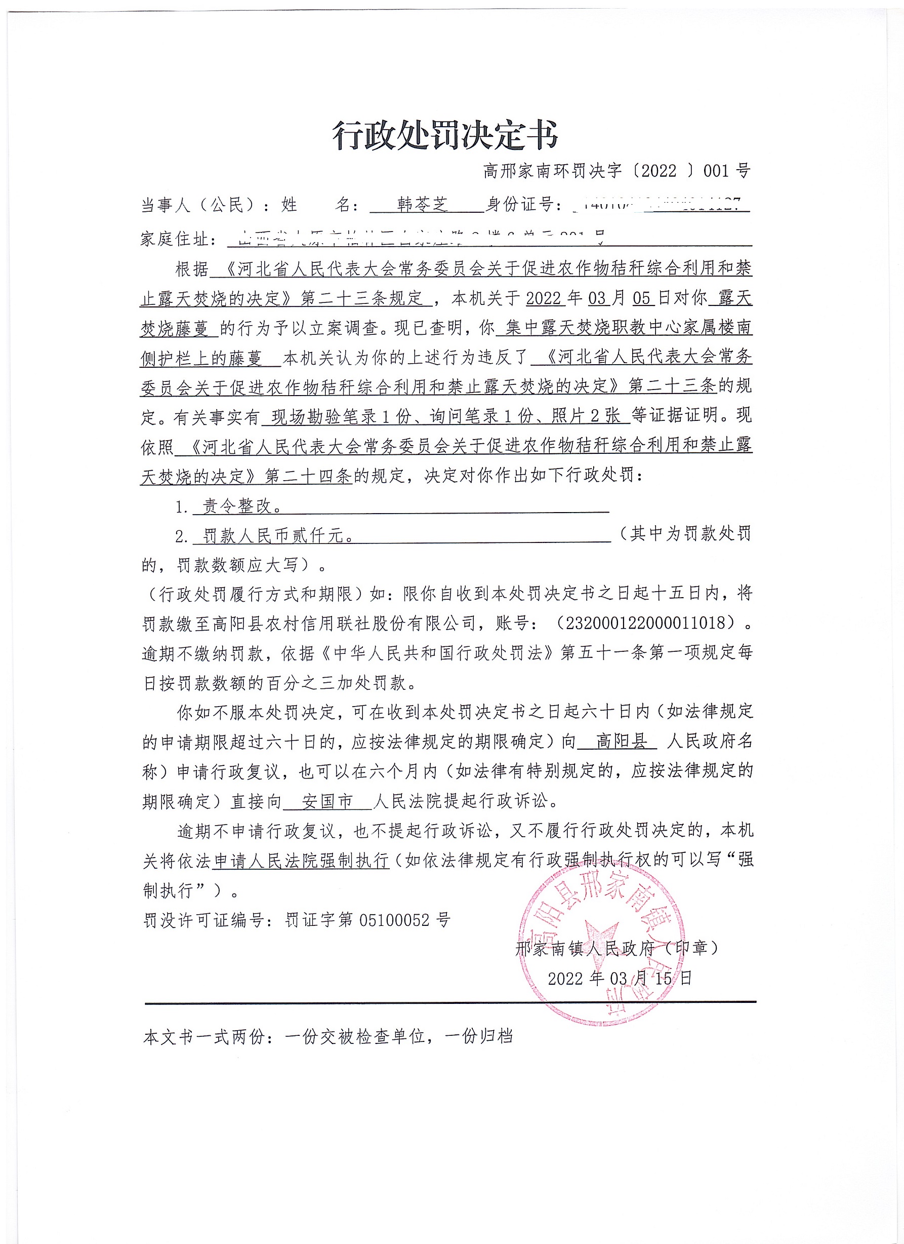 高阳县邢家南镇人民政府于2022年03月15日对当事人韩苓芝下达了《行政处罚决定书》高邢家南环罚决字〔2022 〕001号。