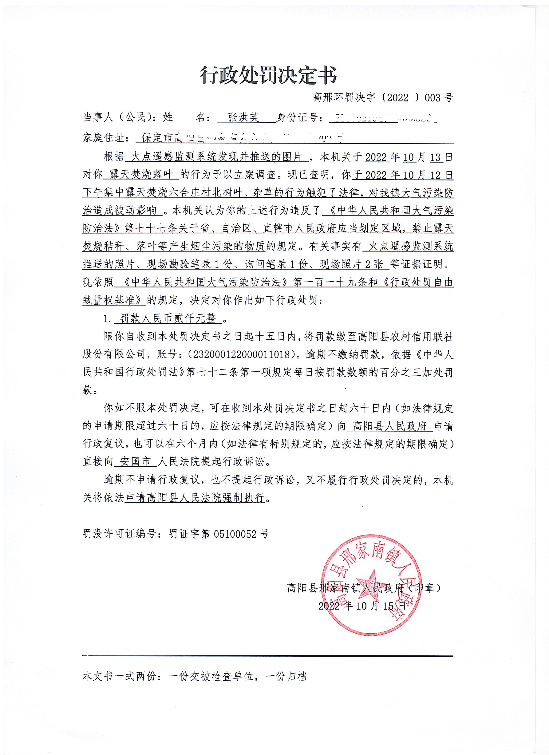 2022年10月12日高阳县邢家南镇综合行政执法队通过火点遥感监测系统发现并推送的图片调查发现保定市高阳县邢家南乡六合庄村张洪英露天焚烧落叶。上述行为违反了《中华人民共和国大气污染防治法》第七十七条关于省、自治区、直辖市人民政府应当划定区域,禁止露天焚烧秸秆、落叶等产生烟尘污染的物质的规定。2022年10月13日填写立案审批表,经镇领导同意后立案调查。