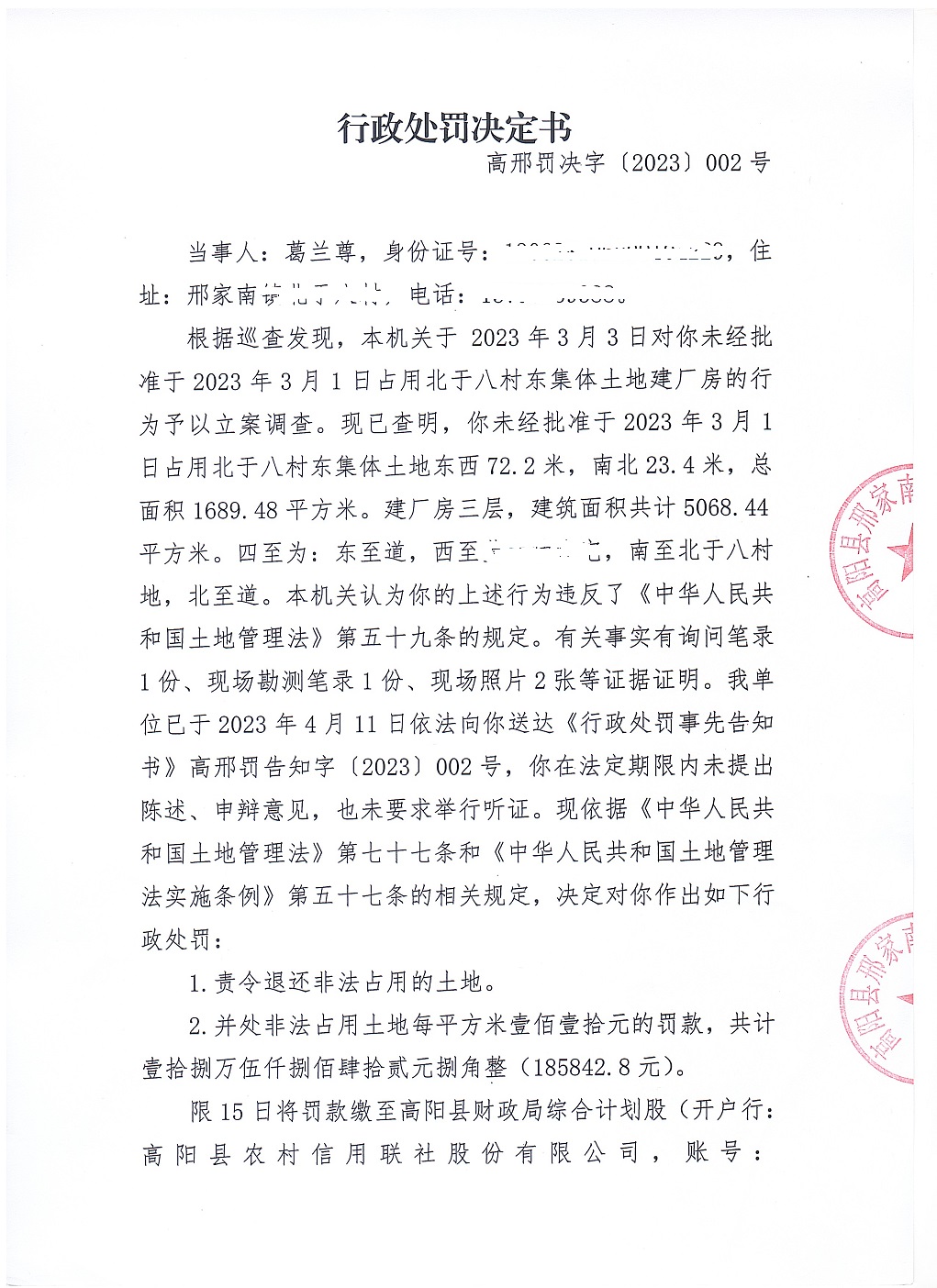 高阳县邢家南镇人民政府于2023年4月19日依法向葛兰尊送达《行政处罚决定书》高邢罚决字〔2023〕002号。