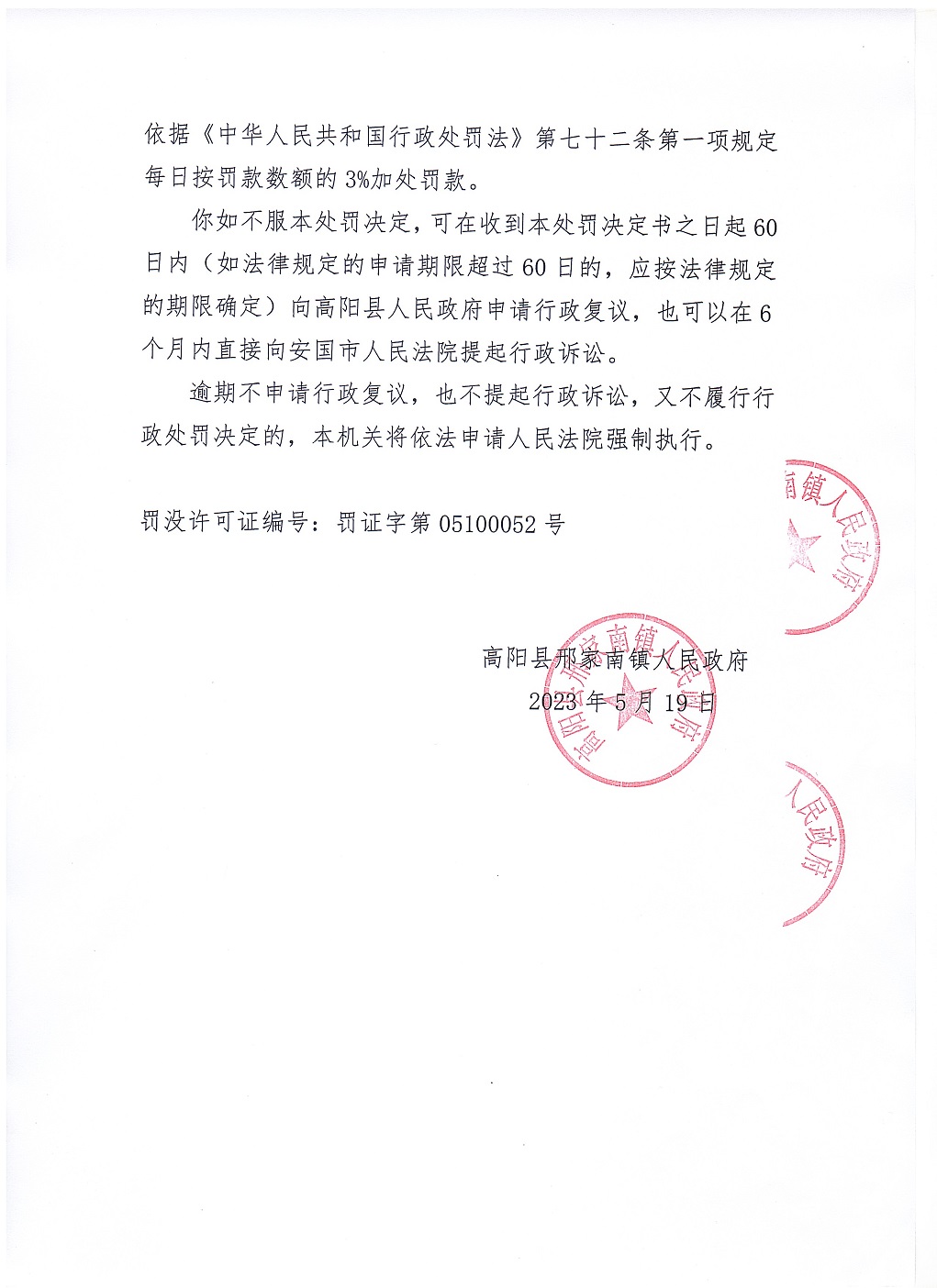 高阳县邢家南镇人民政府于2023年5月19日依法向宋路军送达《行政处罚决定书》高邢罚决字〔2023〕003号。