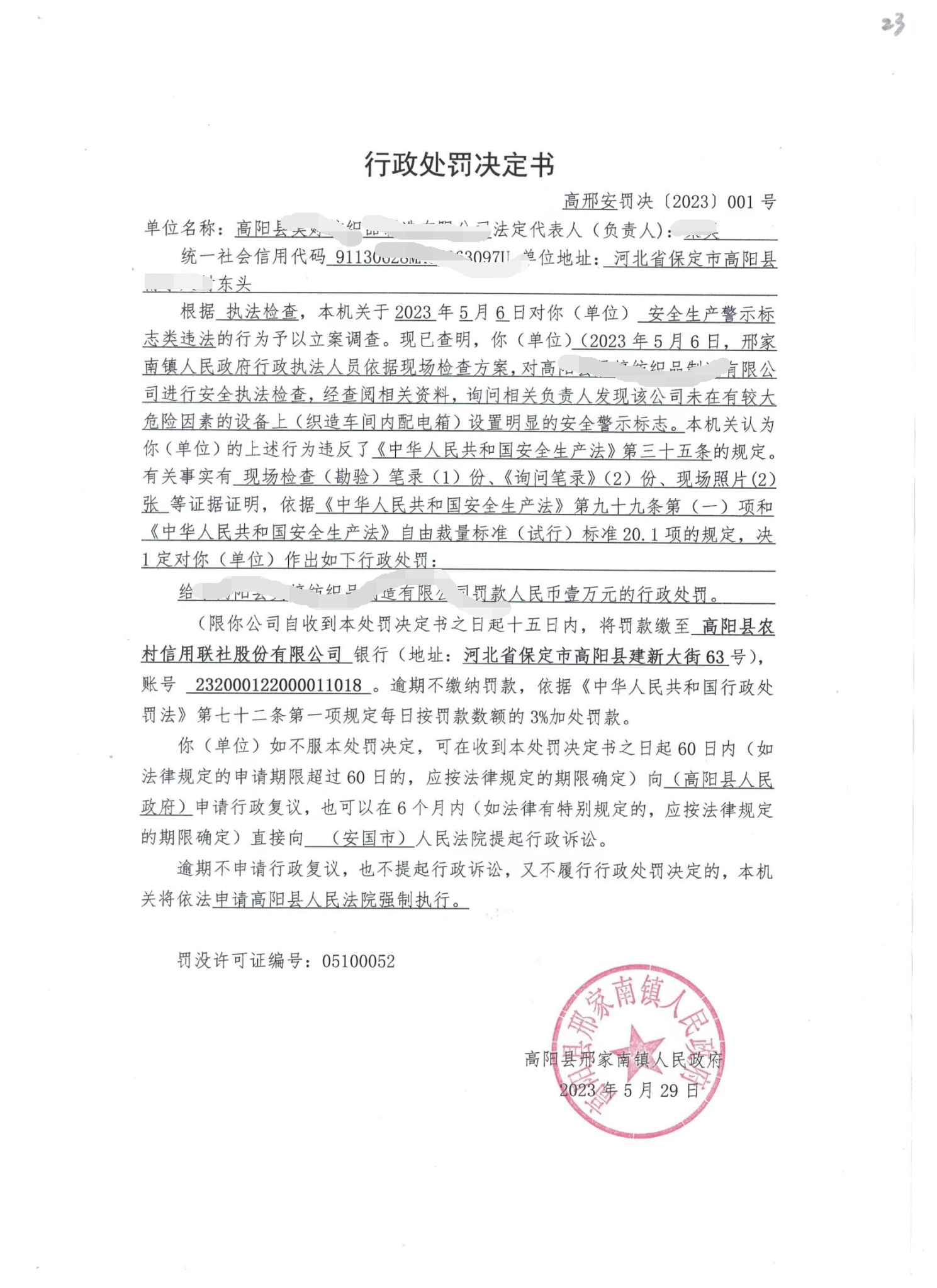 2023年邢家南镇安全生产行政处罚001号