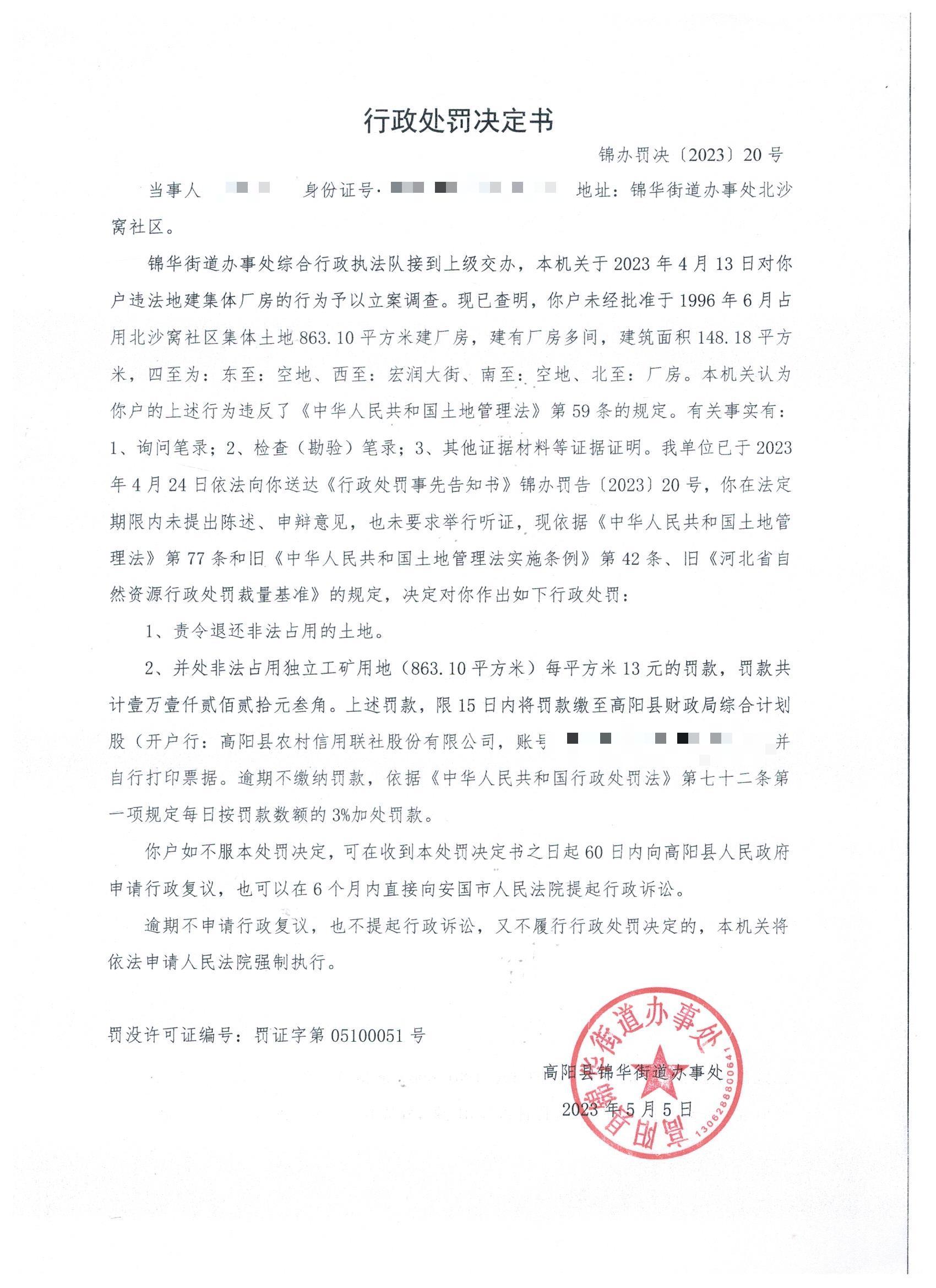 锦办罚决(2023)20号