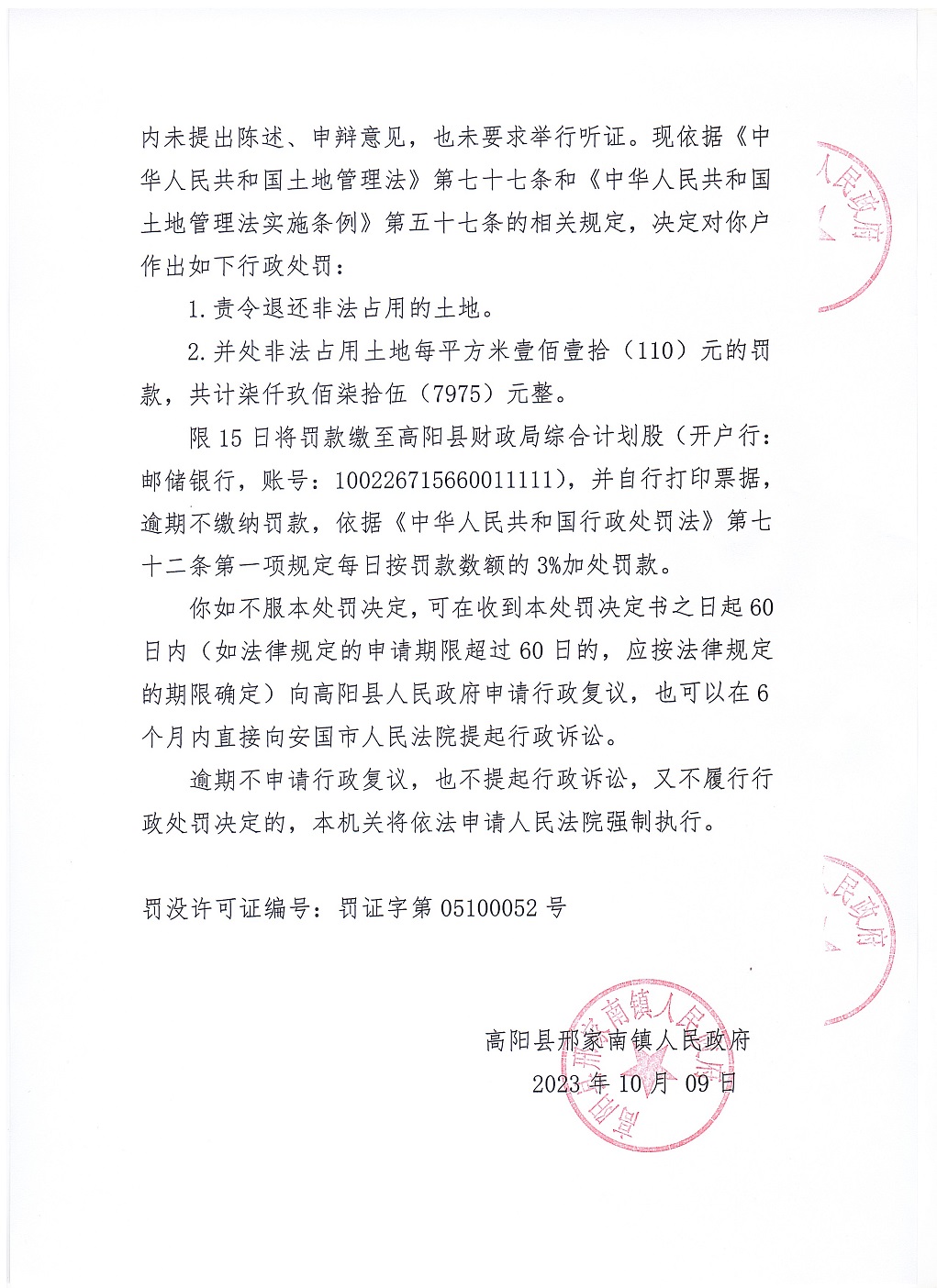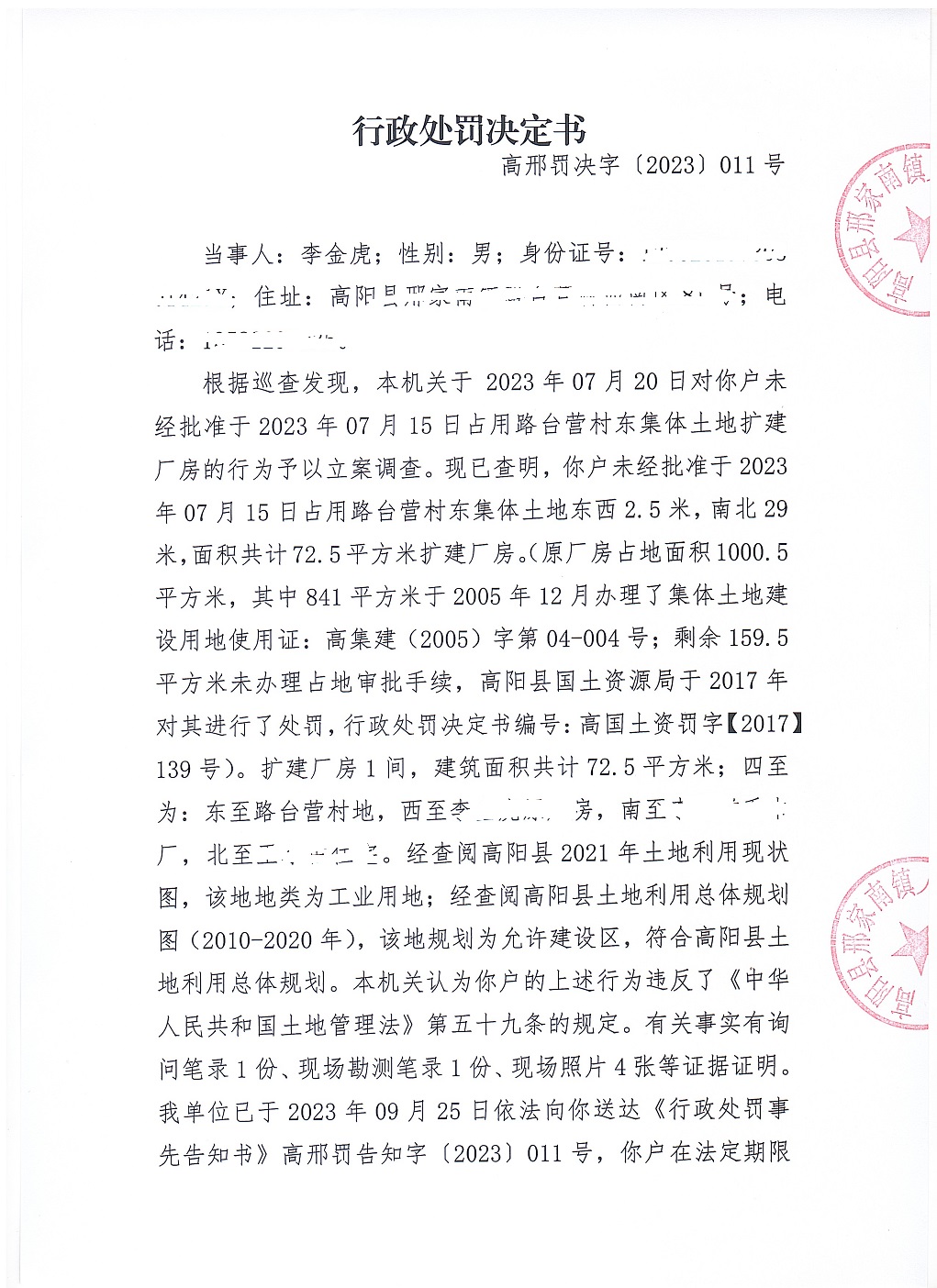 高阳县邢家南镇人民政府于2023年10月9日依法向李金虎送达《行政处罚决定书》高邢罚决字〔2023〕011号.