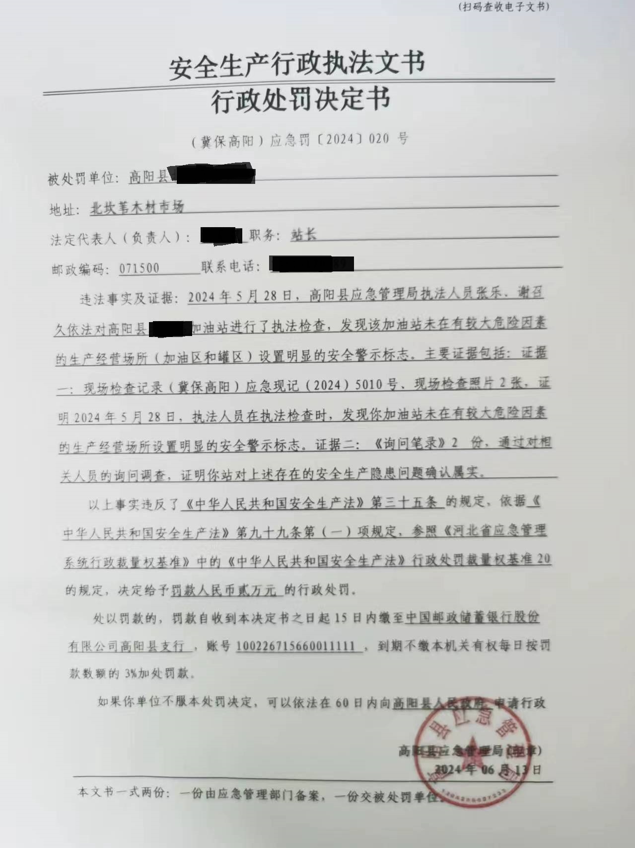 2024年高阳县应急管理局行政处罚决定书020