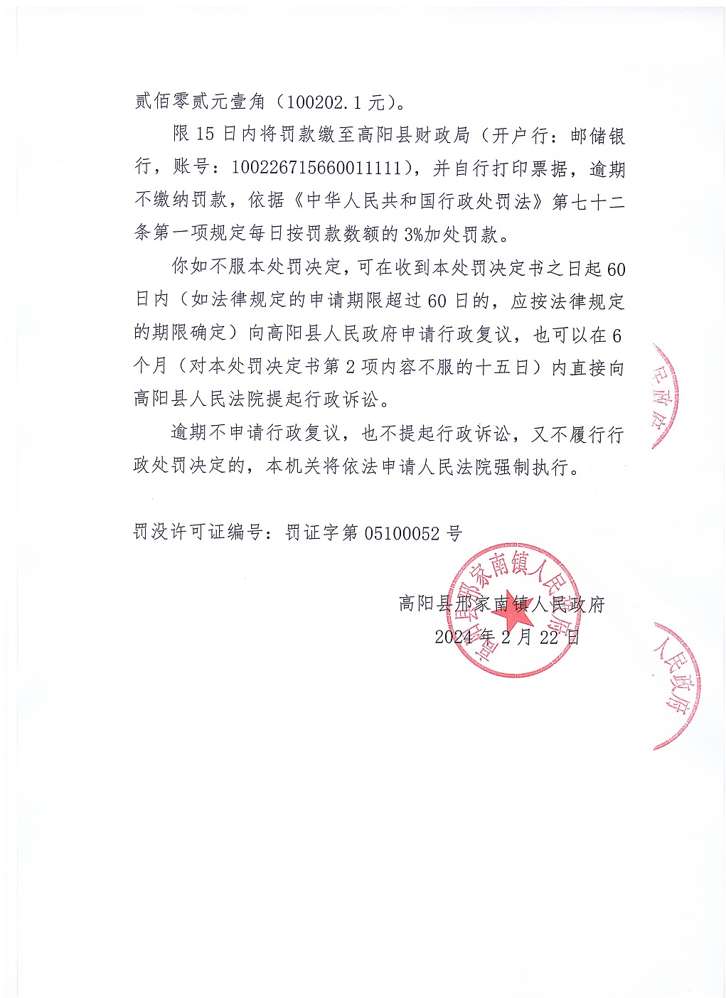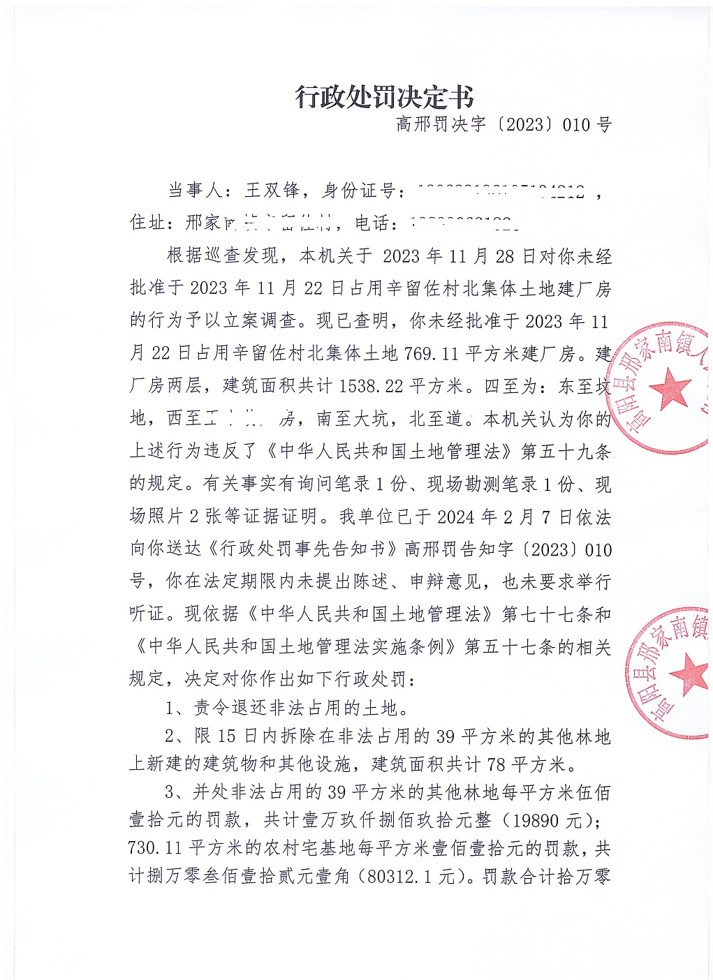 高阳县邢家南镇人民政府于2024年02月22日依法向王双锋送达《行政处罚决定书》高邢罚决字〔2023〕010号。