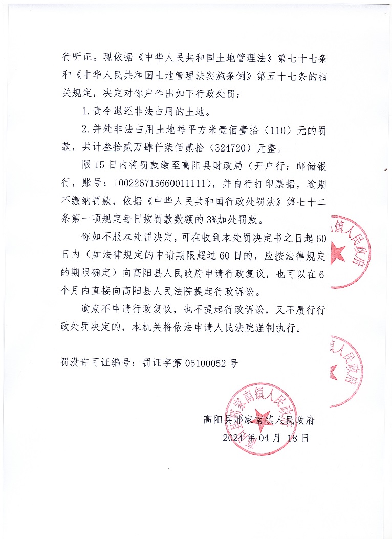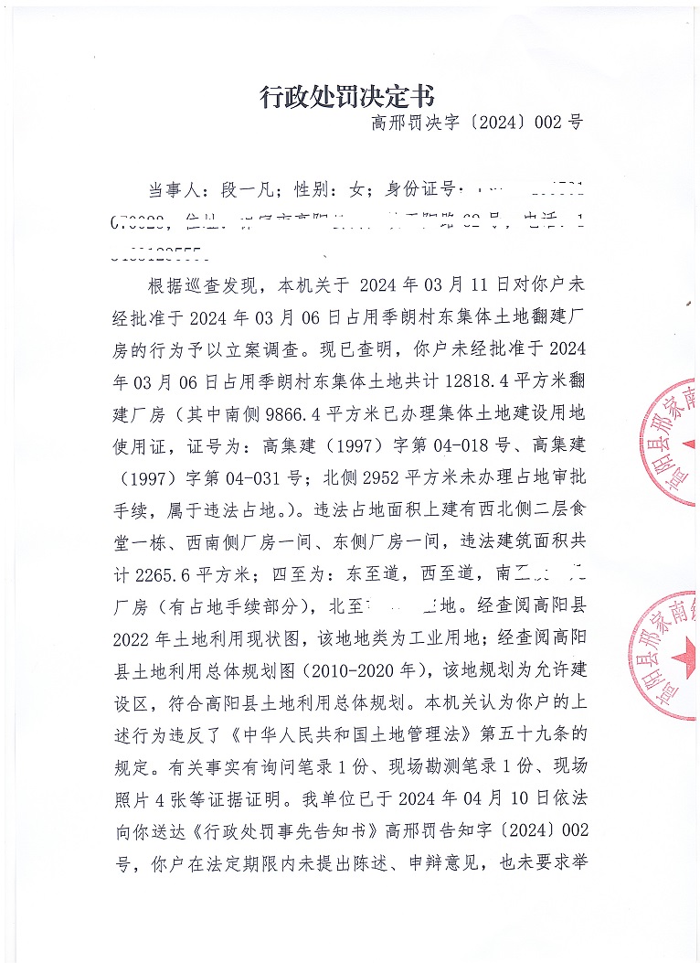 高阳县邢家南镇人民政府于2024年04月18日依法向段一凡送达《行政处罚决定书》高邢罚决字〔2023〕002号。