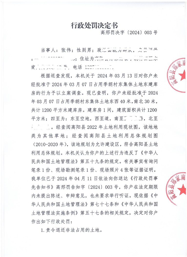 高阳县邢家南镇人民政府于2024年04月19日依法向张伟送达《行政处罚决定书》高邢罚决字〔2024〕003号。