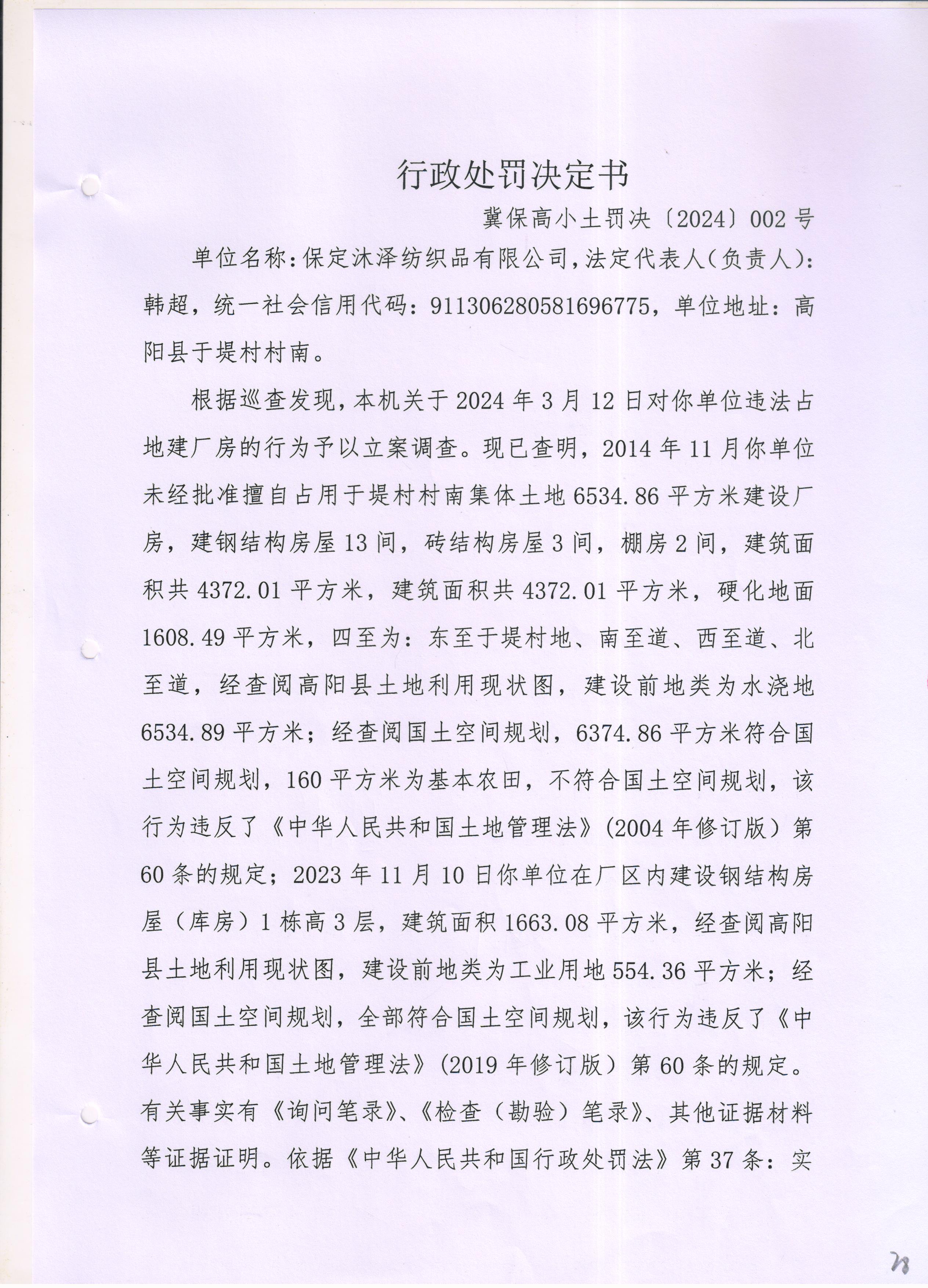 保定沐泽纺织品有限公司违法占地案