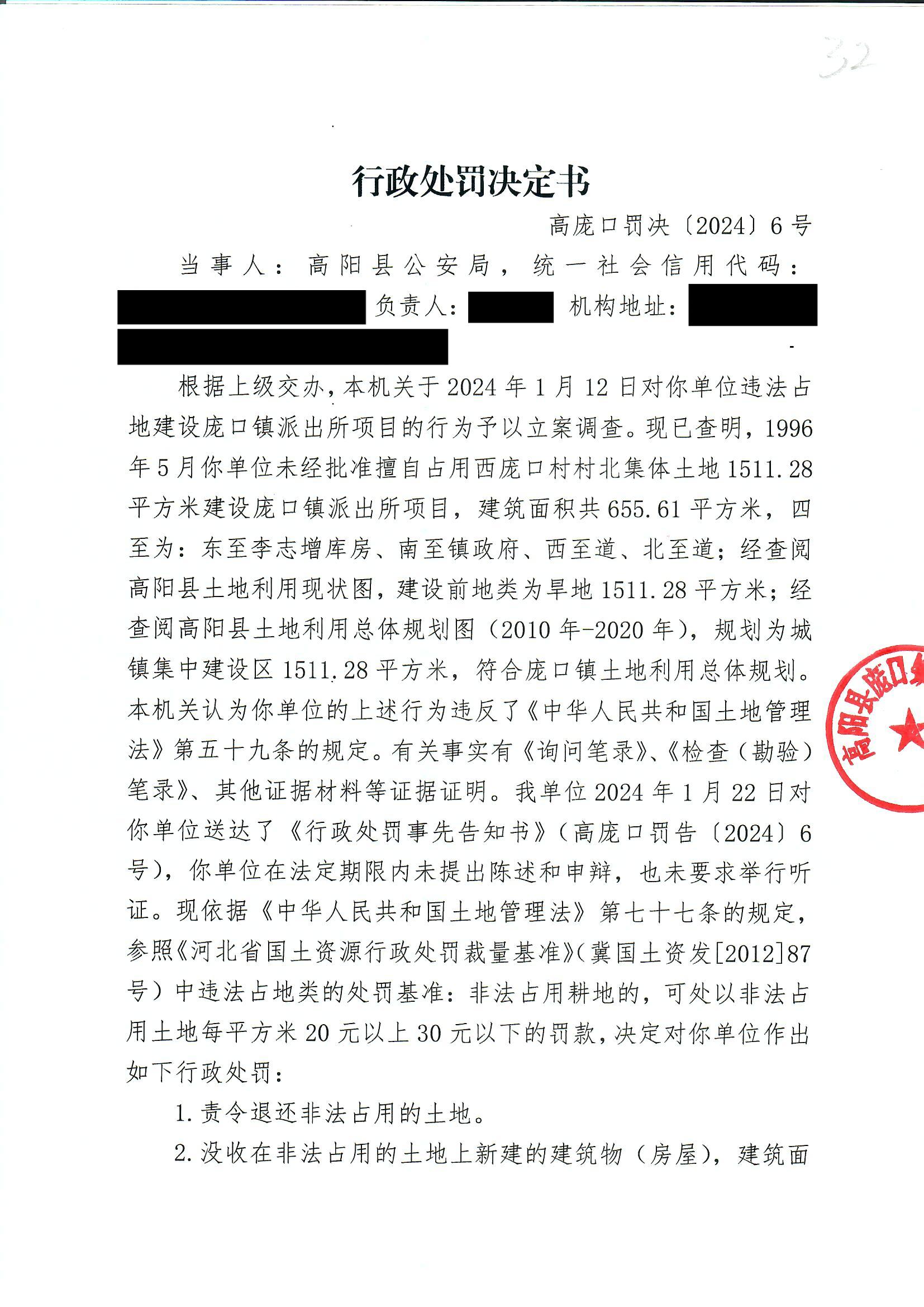 《行政处罚决定书》高庞口罚决【2024】6号