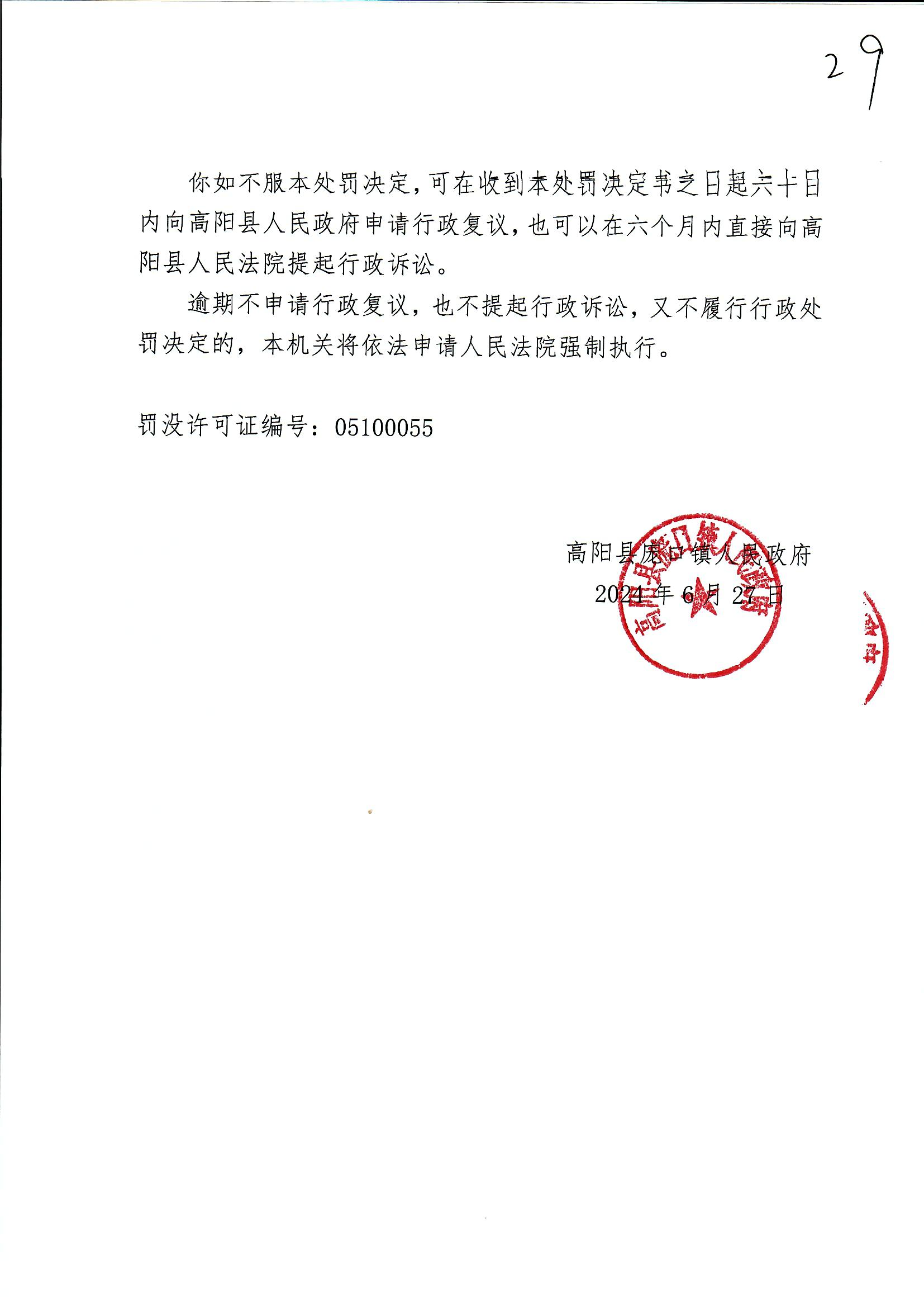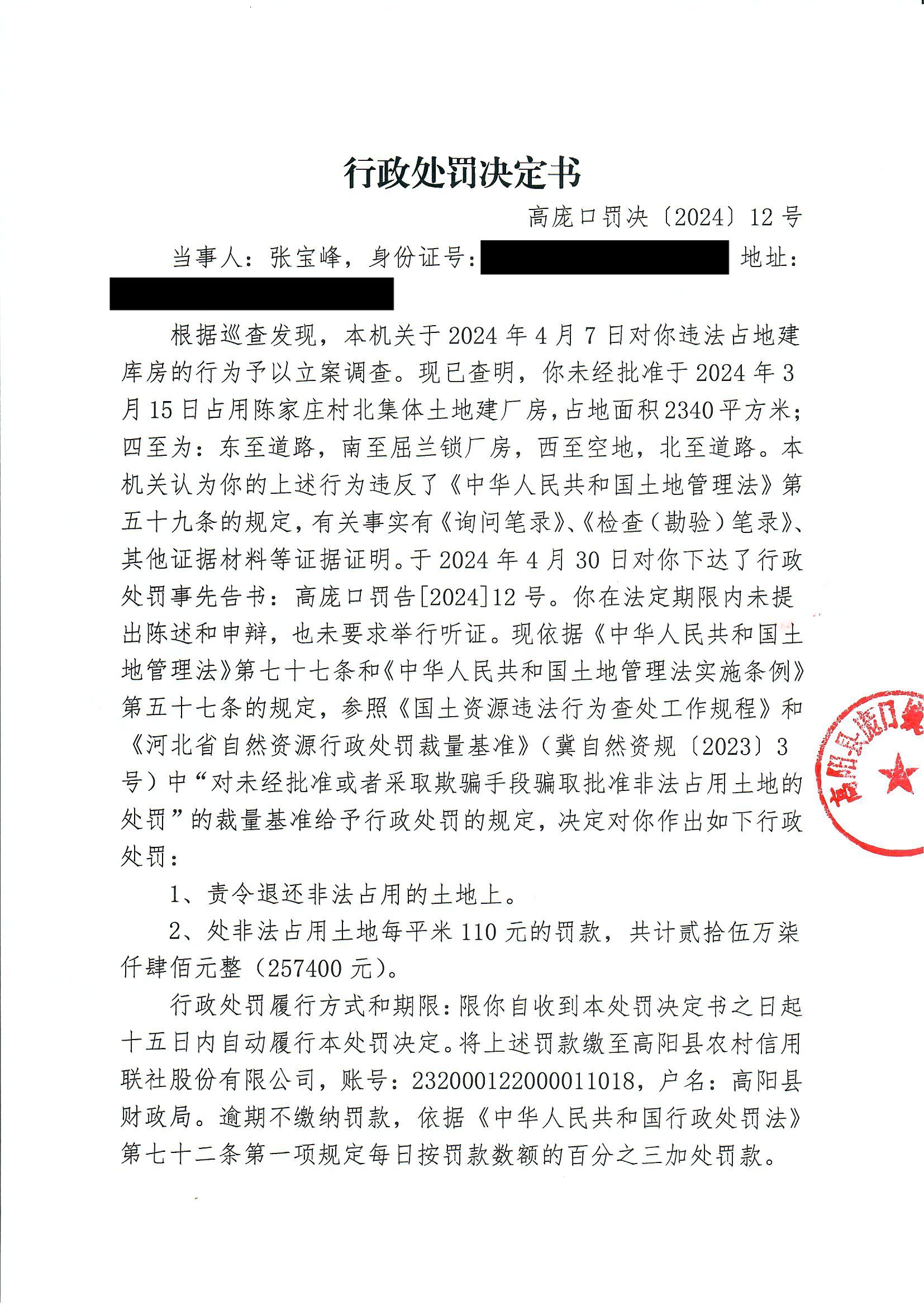 《行政处罚决定书》高庞口罚决【2024】12号