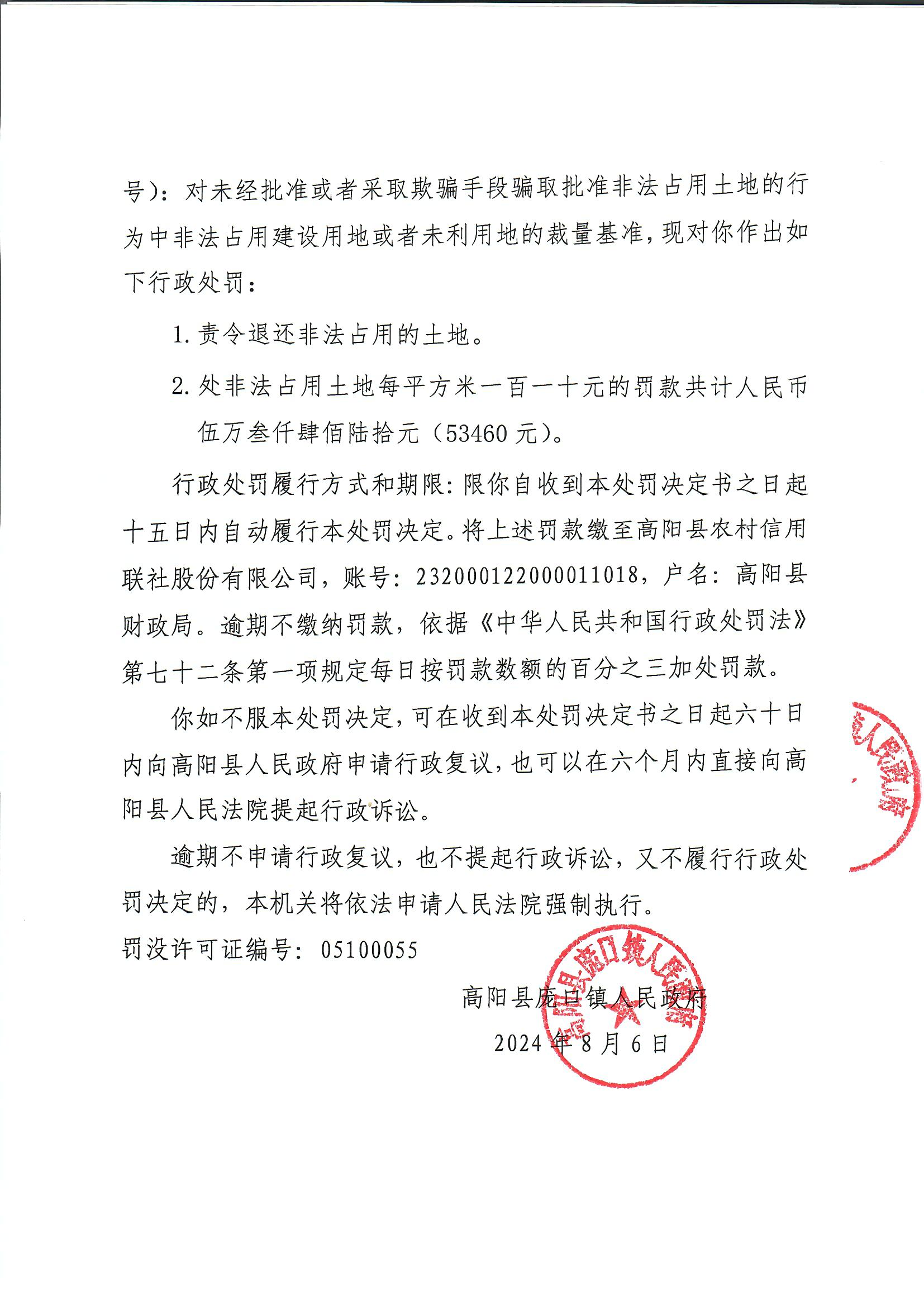 《行政处罚决定书》高庞口罚决【2024】21号