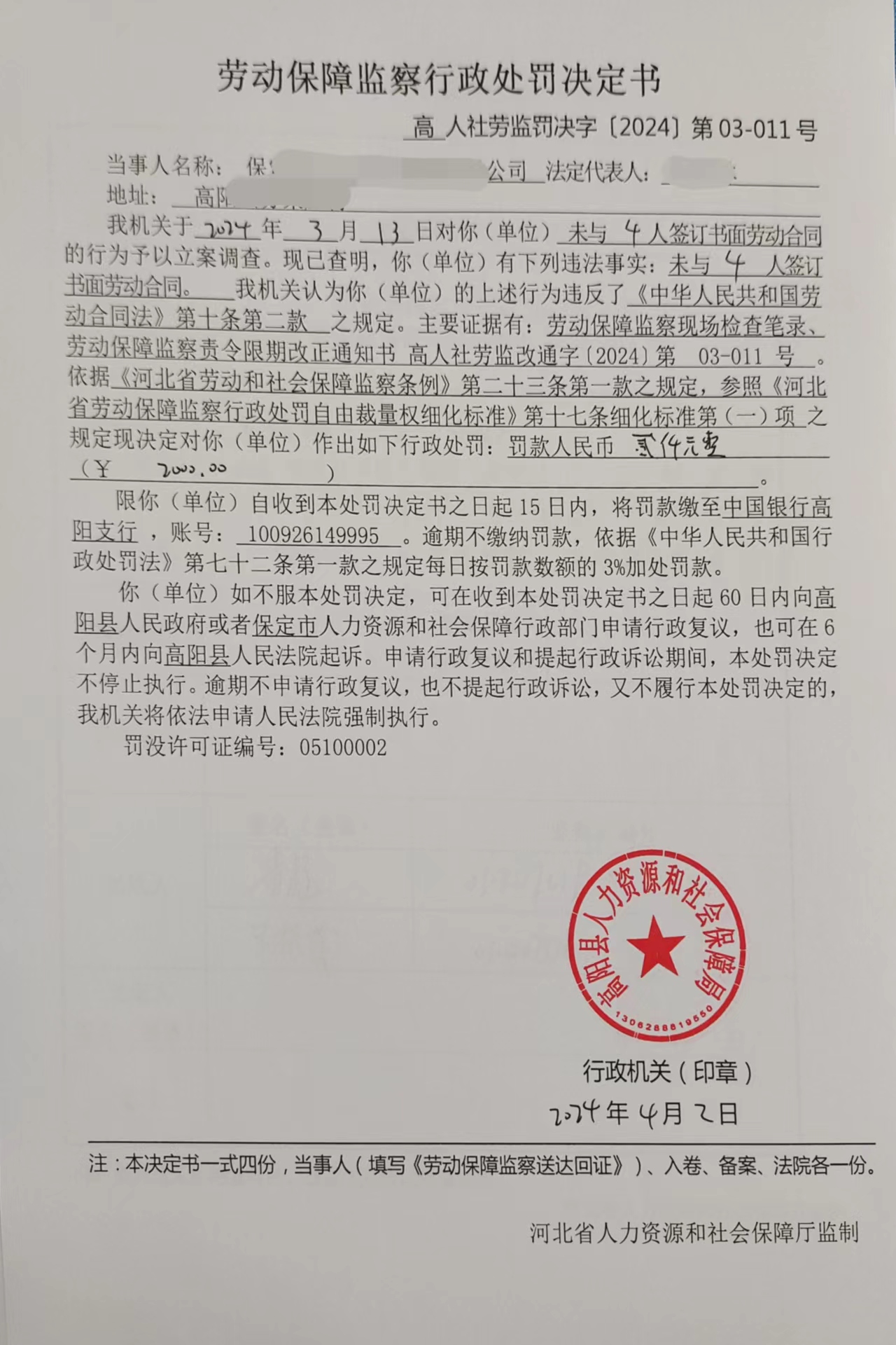 劳动保障监察行政处罚决定书 - 高人社劳监罚决字〔2024〕第03 - 011号