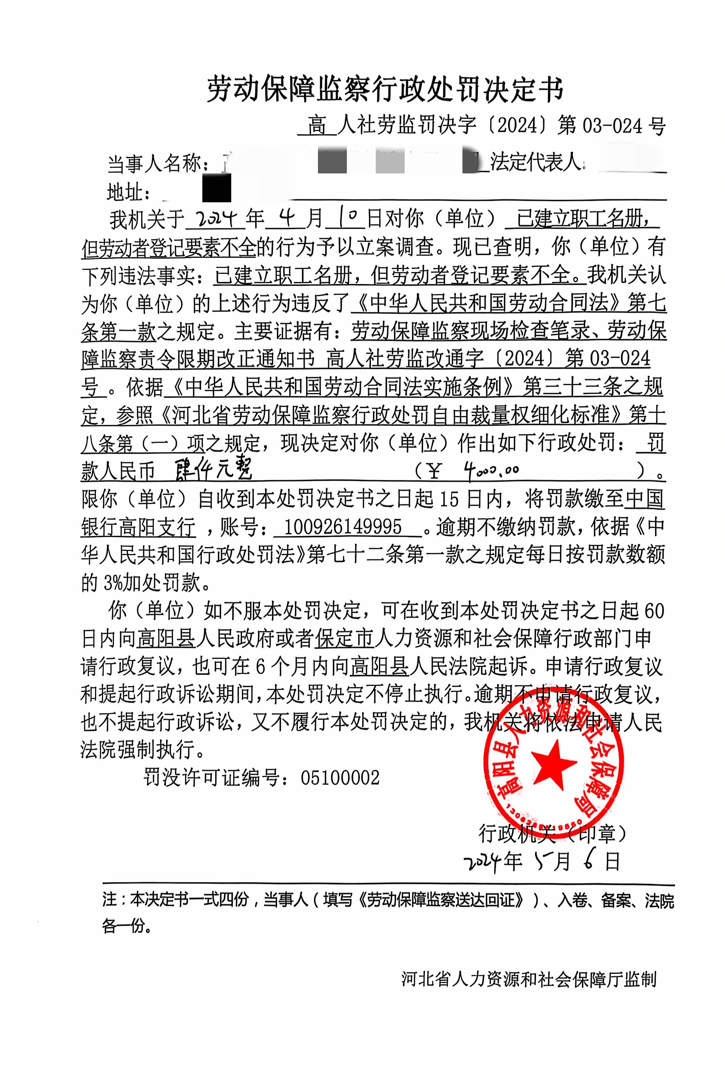 劳动保障监察行政处罚决定书 - 高人社劳监罚决字〔2024〕第03 - 024号