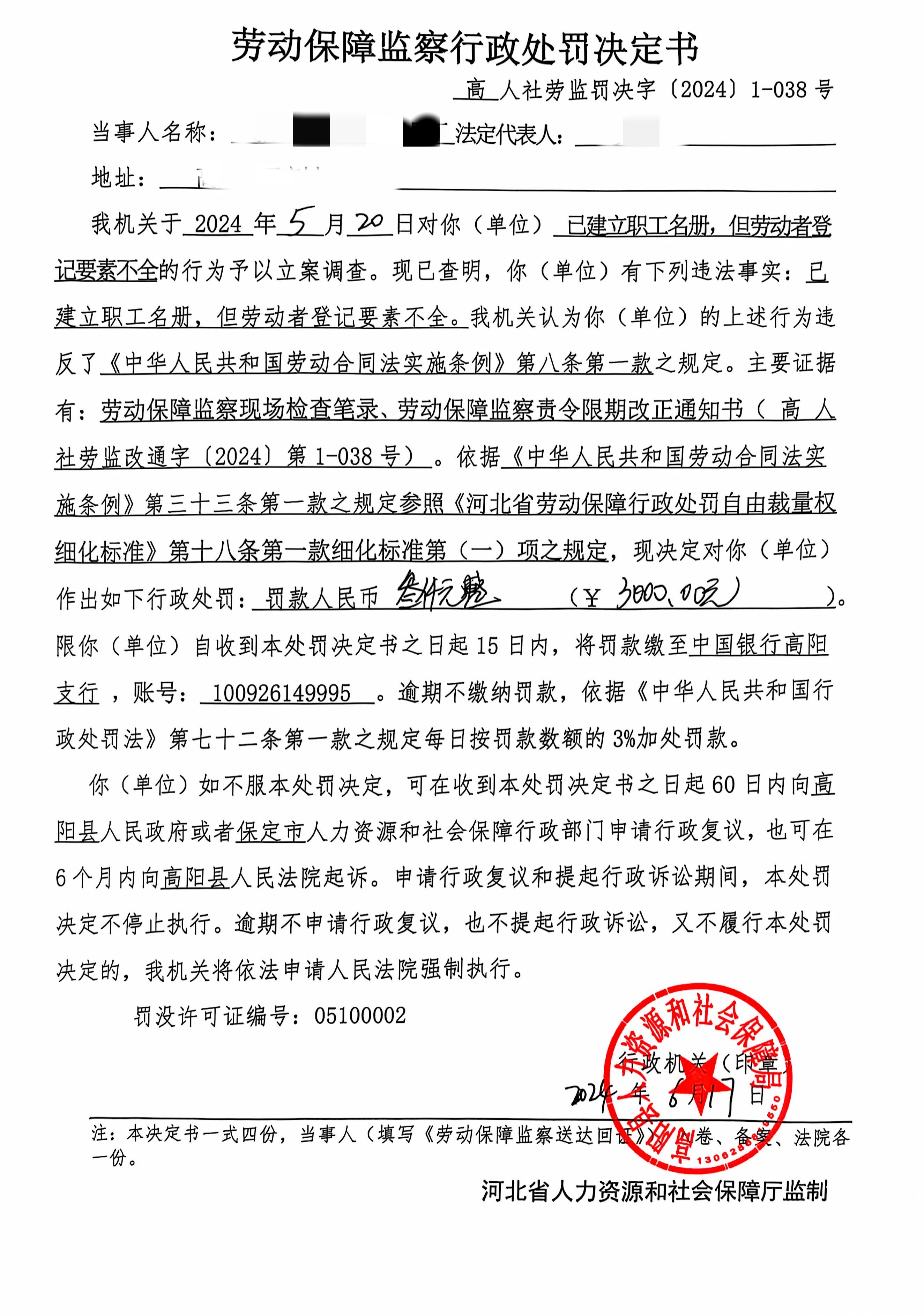 劳动保障监察行政处罚决定书 - 高人社劳监罚决字〔2024〕第1 - 038号