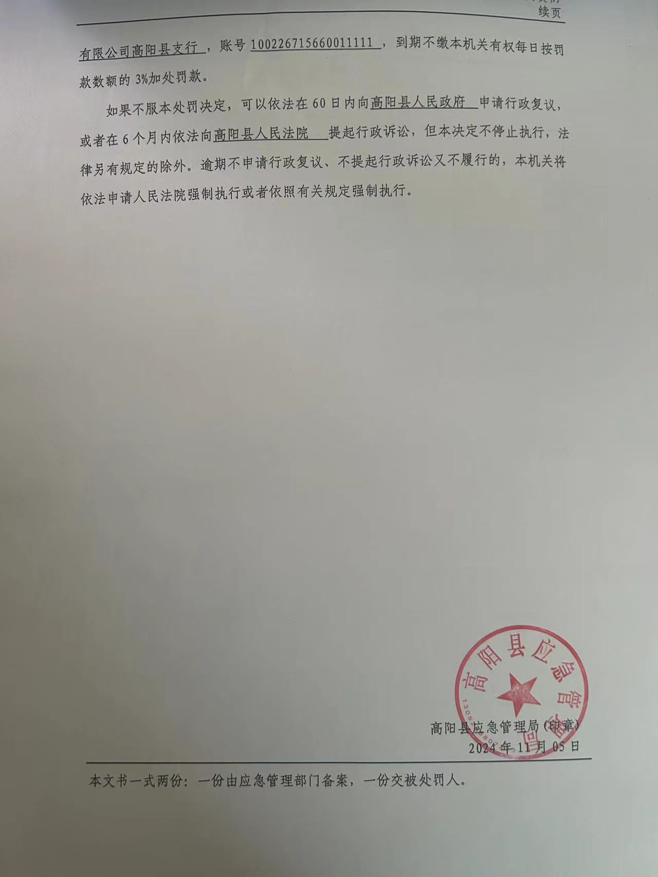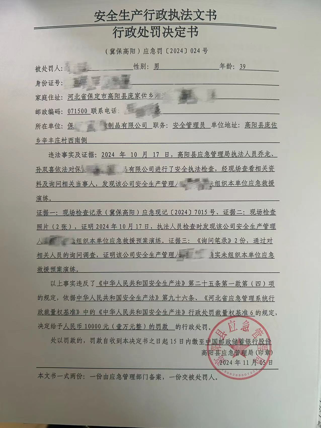 2024年高阳县应急管理局行政处罚决定书024