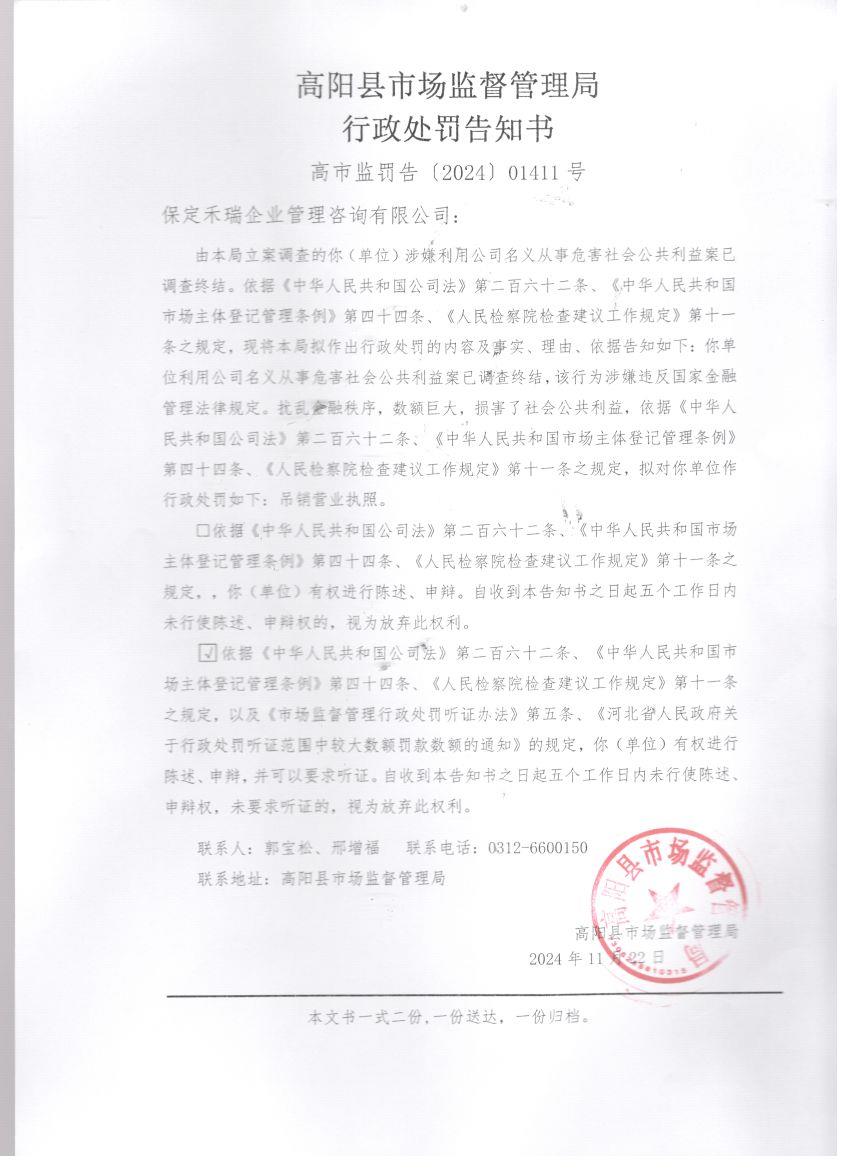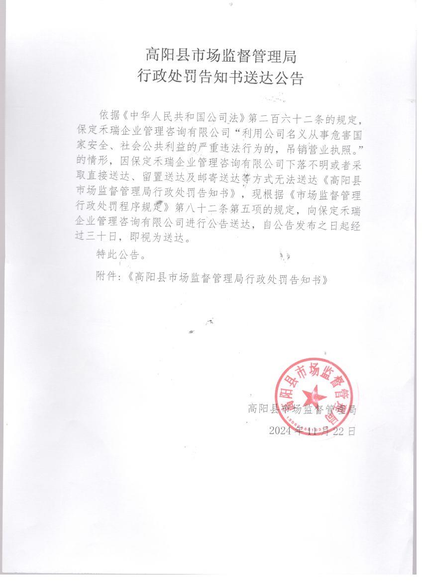 高阳县市场监督管理局行政处罚告知书送达公告