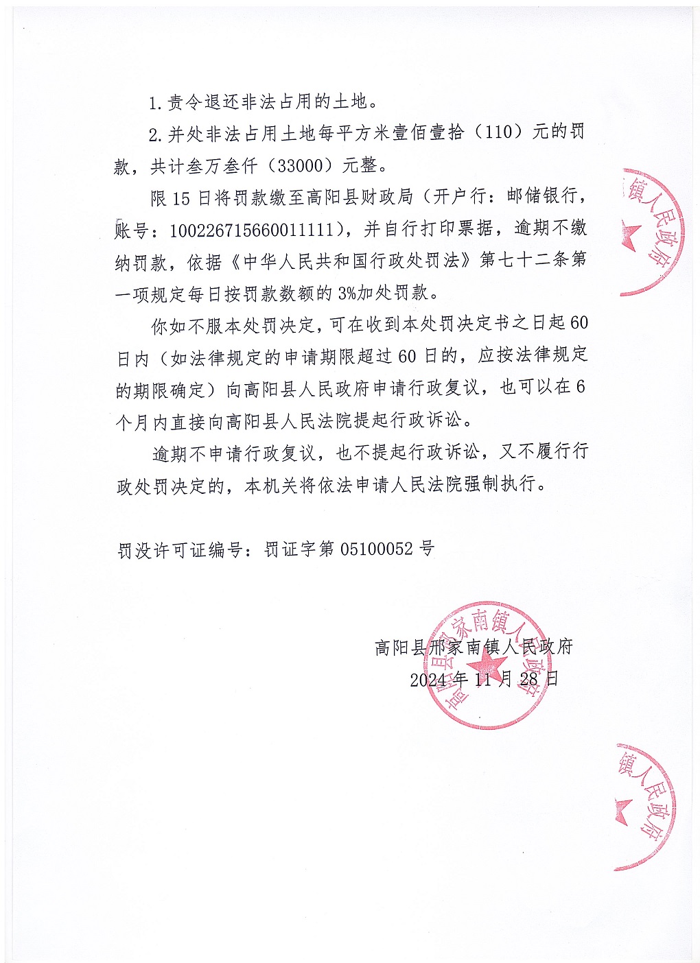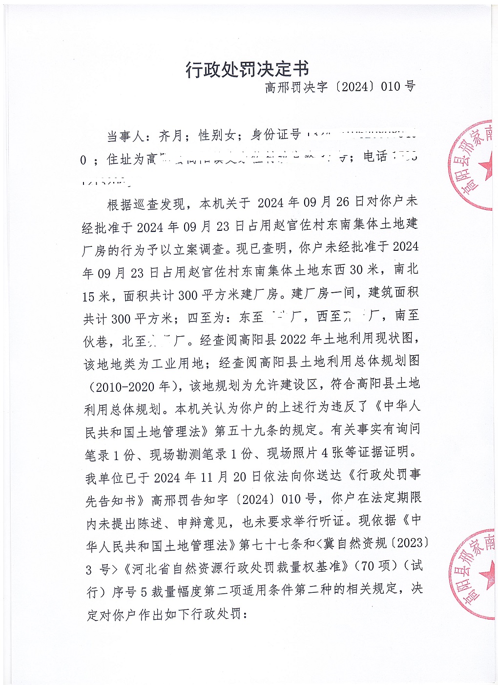 高阳县邢家南镇人民政府于2024年11月28日依法向齐月送达《行政处罚决定书》高邢罚决字〔2024〕010号。