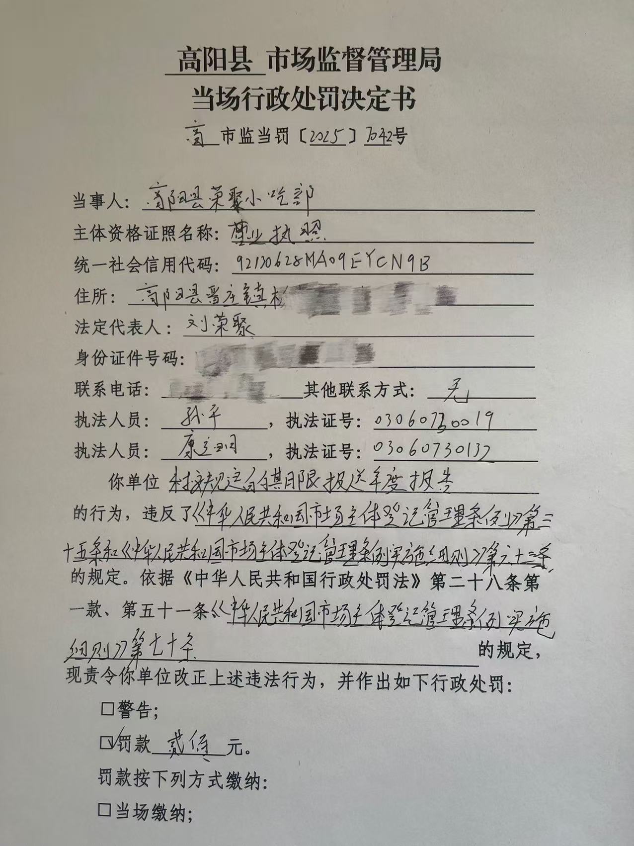 高阳县荣聚小吃部未按规定的期限报送年度报告案