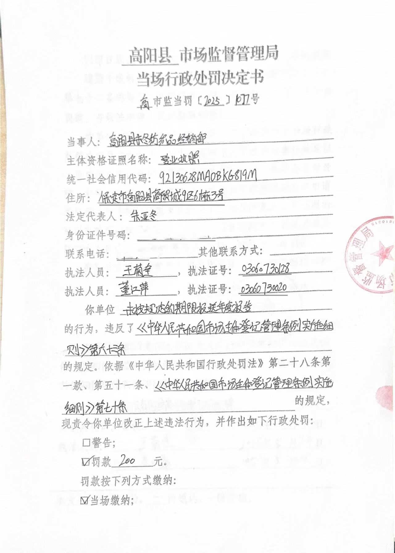 高阳县朱冬纺织品经销部未按规定的期限报送年度报告案