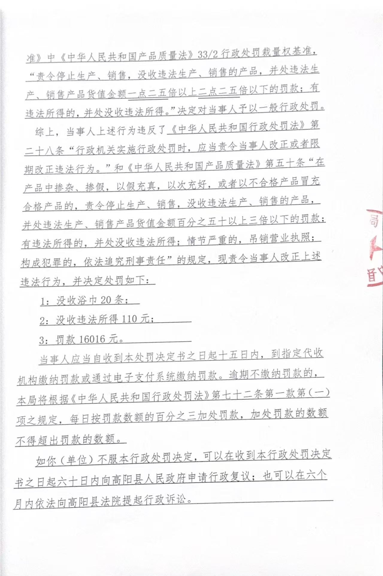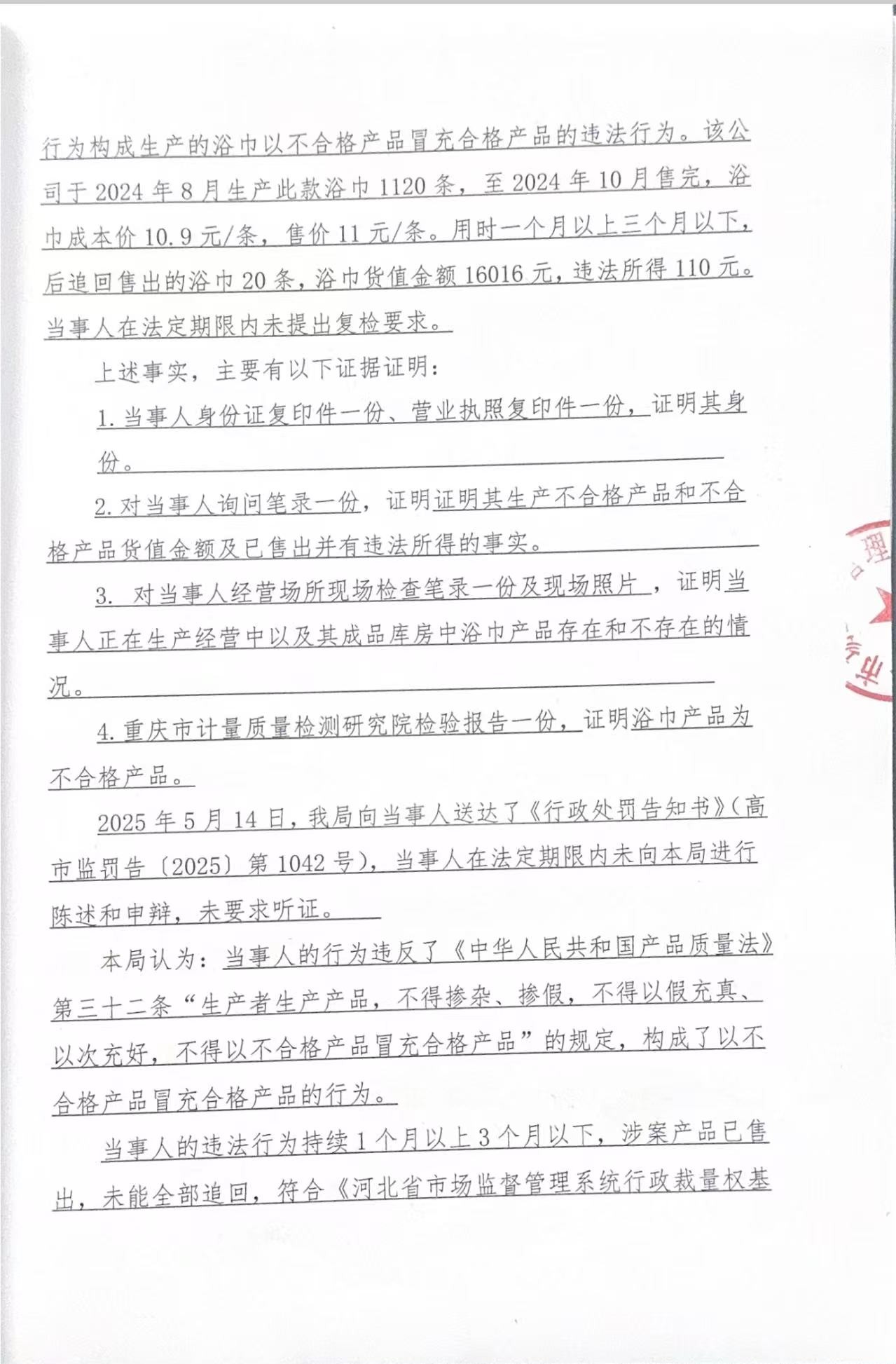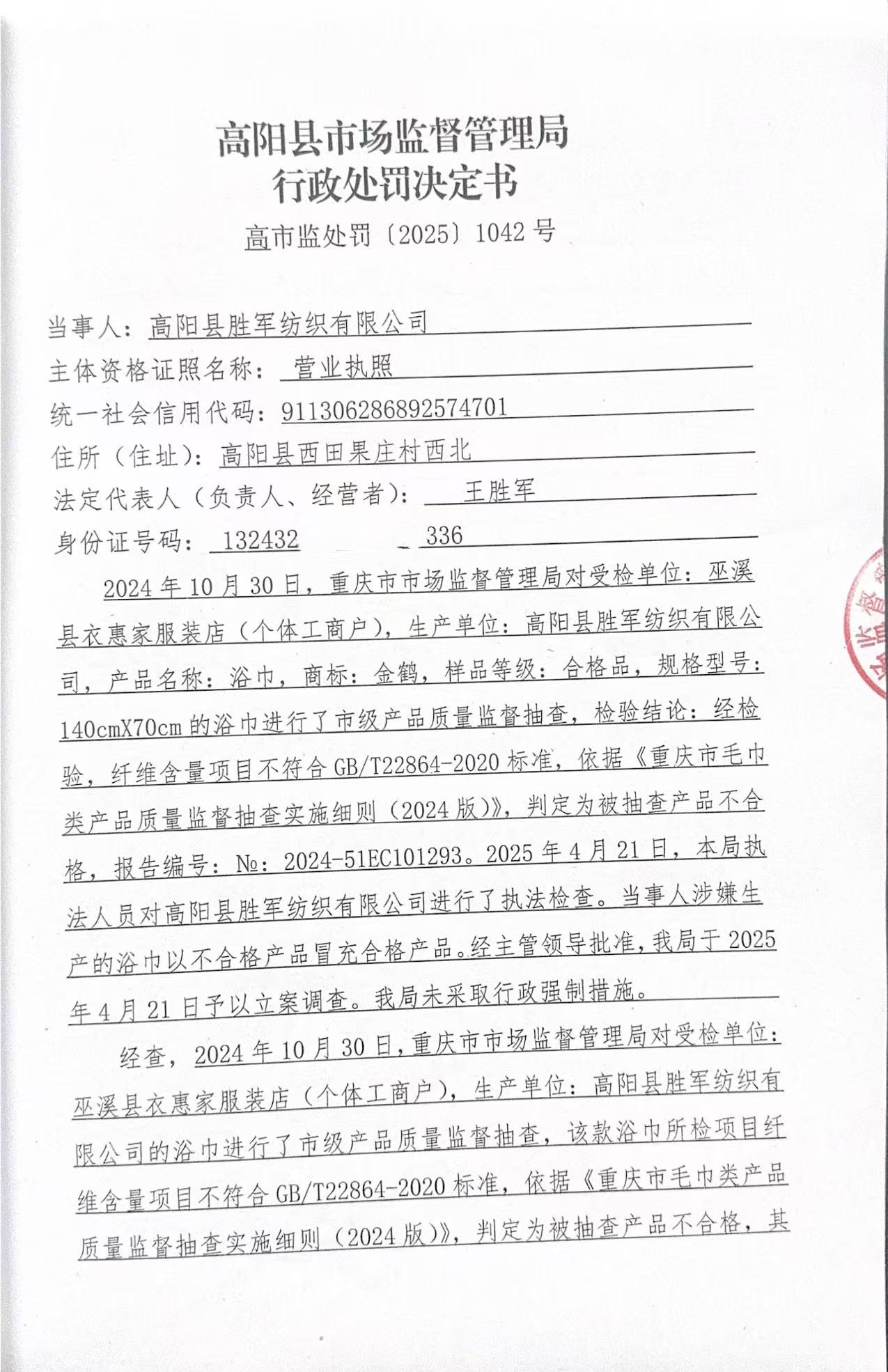 高阳县胜军纺织有限公司生产的浴巾以不合格产品冒充合格产品案