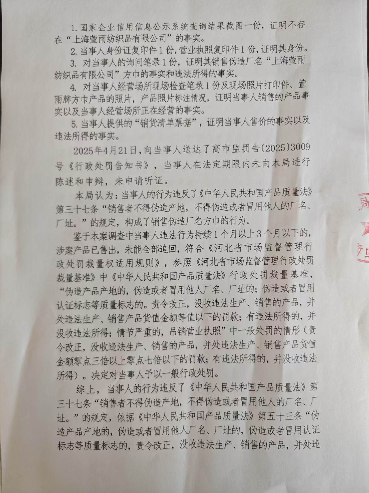 高阳县彩腾纺织品经销部销售伪造厂名方巾案