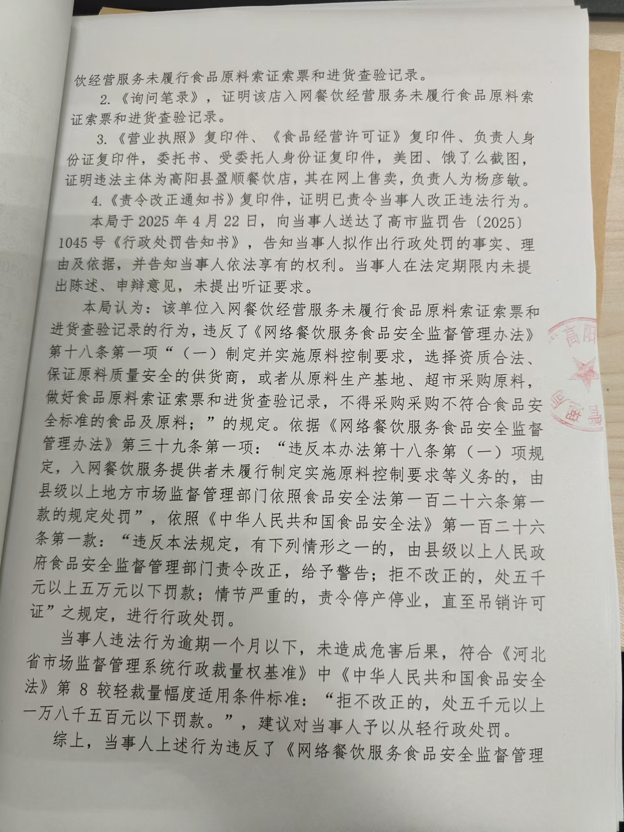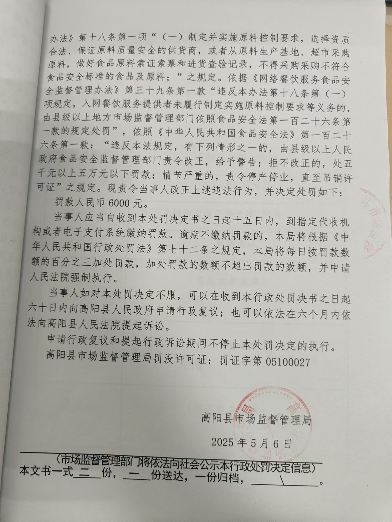 高阳县盈顺餐饮店入网餐饮经营服务未履行索证索票和进货查验记录案