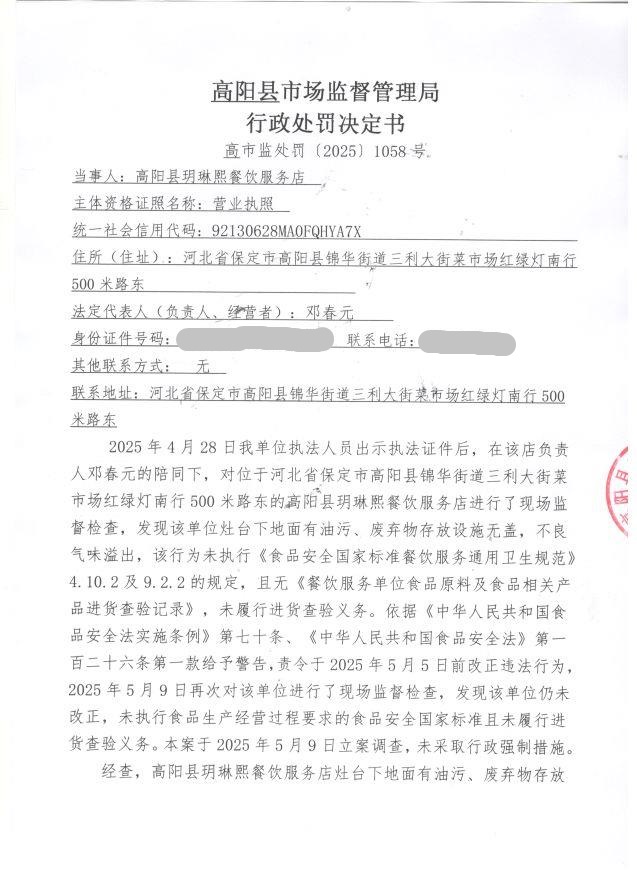 高阳县玥琳熙餐饮服务店未执行食品生产经营过程要求的食品安全国家标准且未履行进货查验义务案