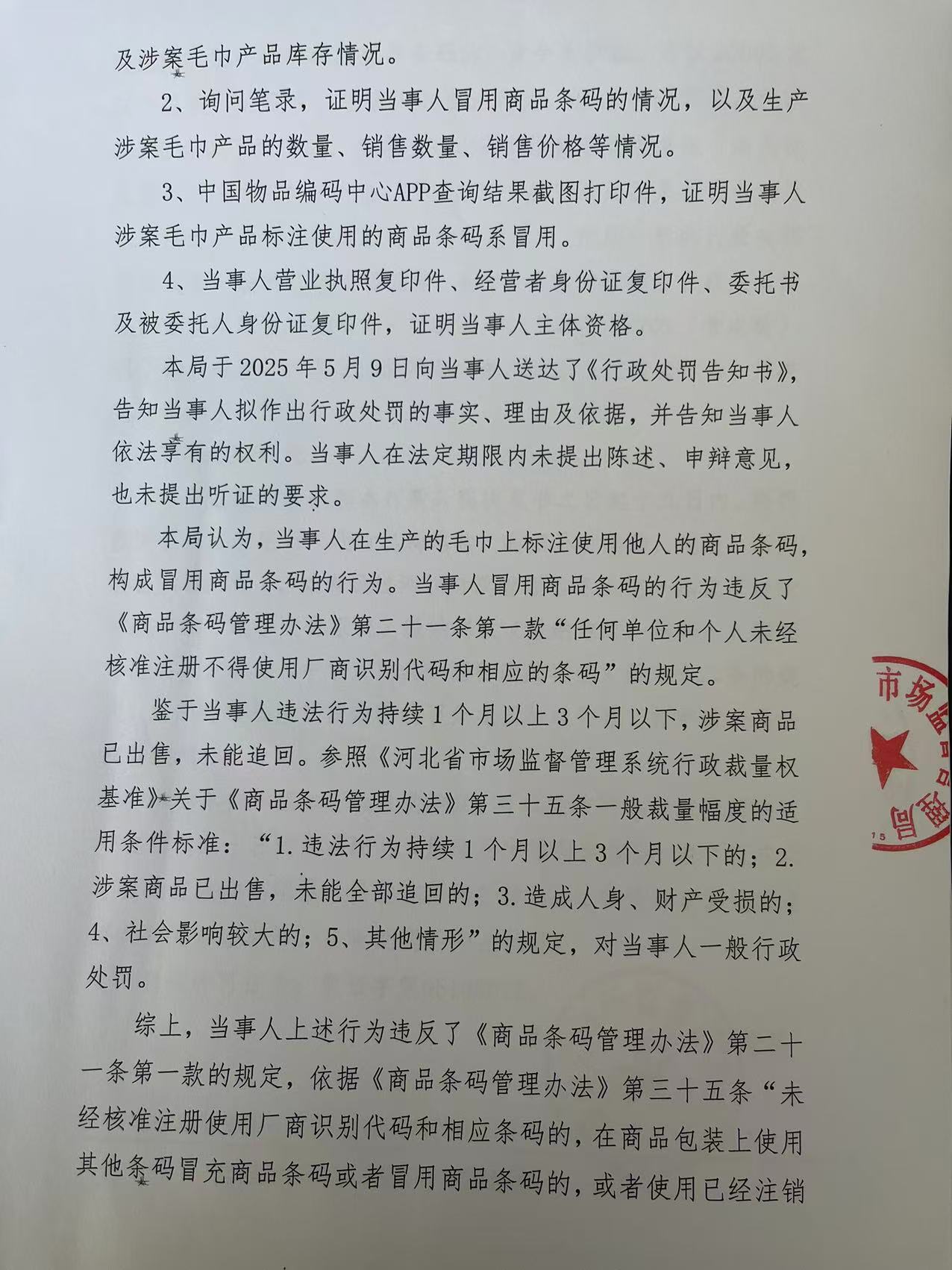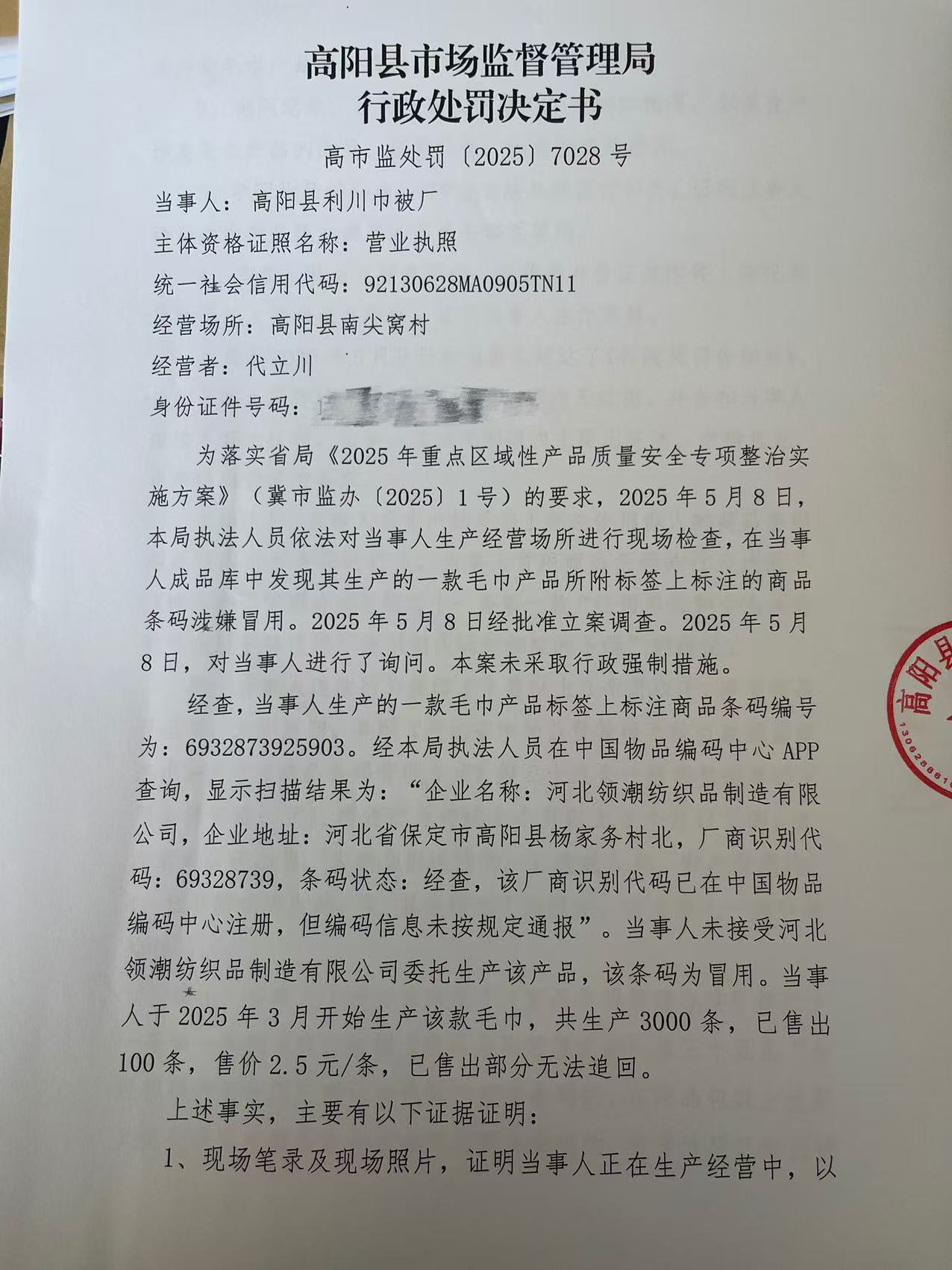 高阳县利川巾被厂生产的毛巾冒用商品条码案