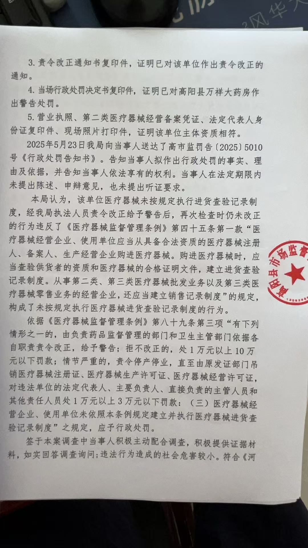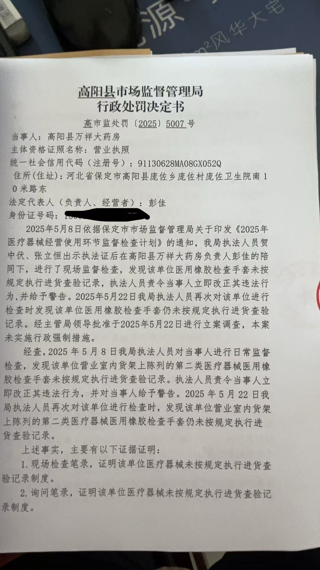 高阳县万祥大药房未按规定执行医疗器械进货查验记录制度案