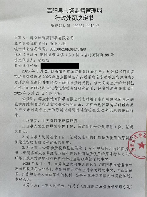 辉众制造高阳县有限公司未对用于生产的原辅材料进行进货检查验收和记录案