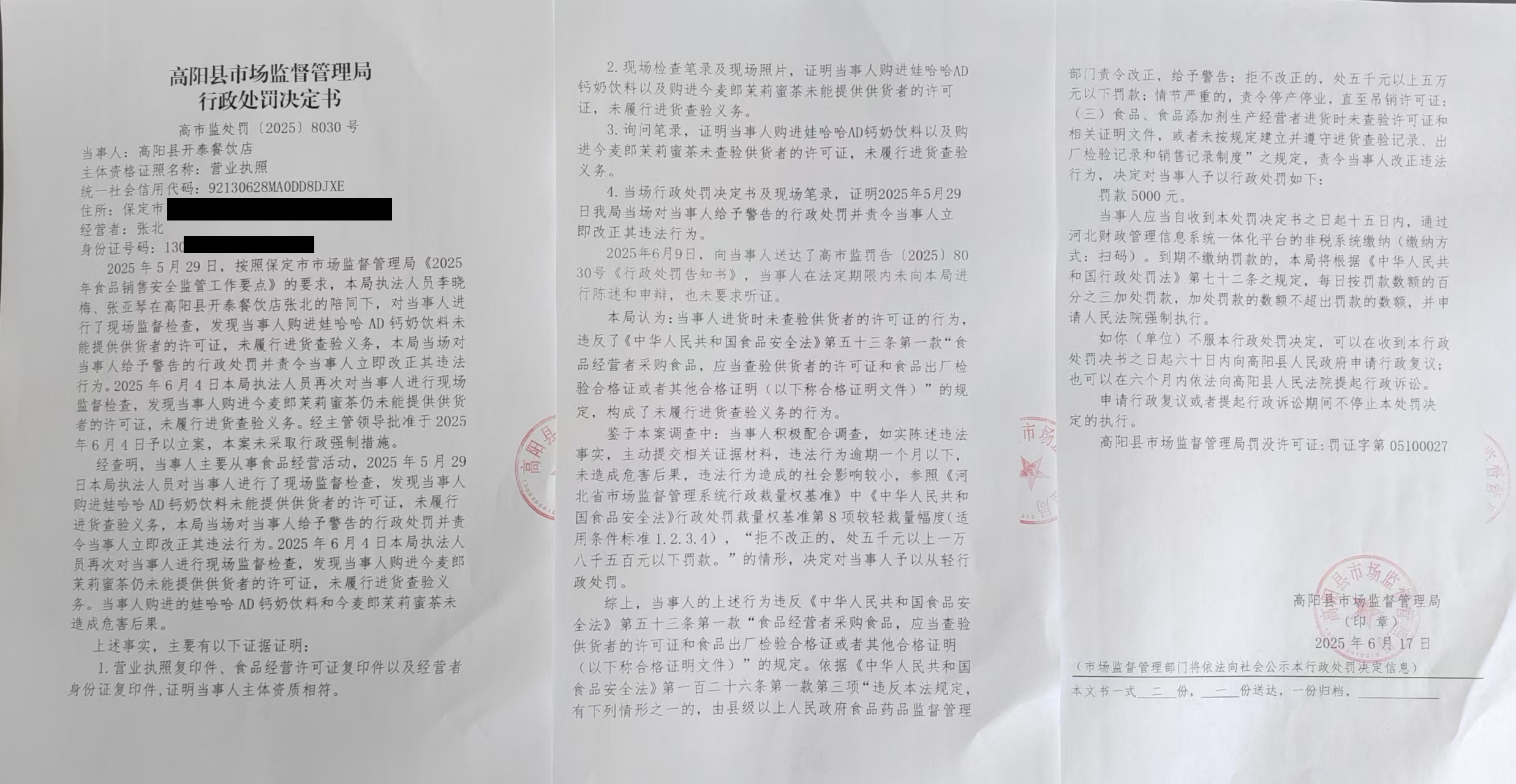 高阳县开泰餐饮店未履行进货查验义务案