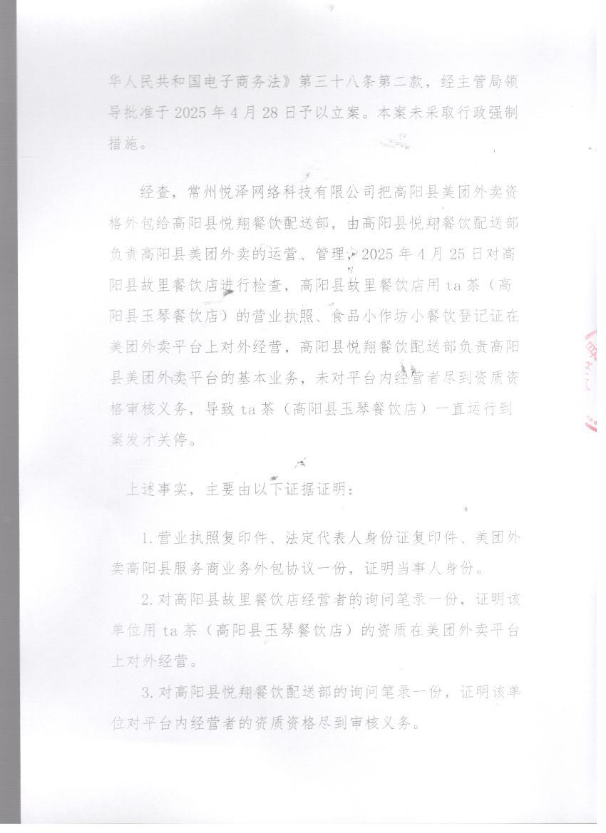 高阳县悦翔餐饮配送部对平台内经营者的资质资格未尽到审查义务案