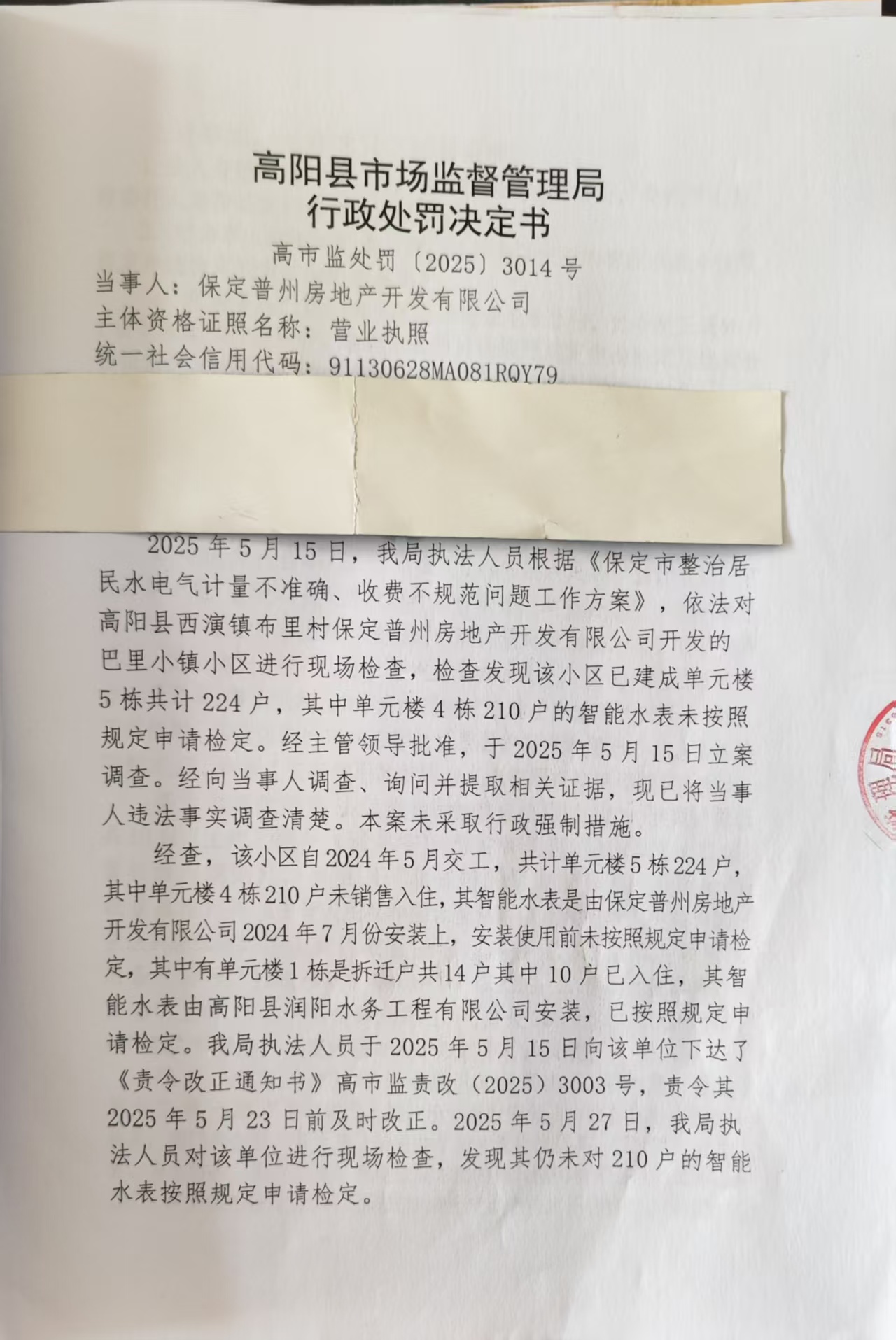 保定普州房地产开发有限公司安装使用的智能水表未按照规定申请检定案