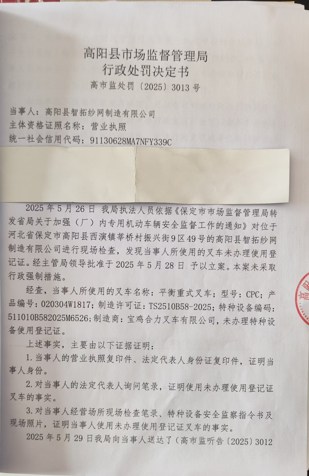 高阳县智拓纱网制造有限公司使用未办理使用登记证叉车案