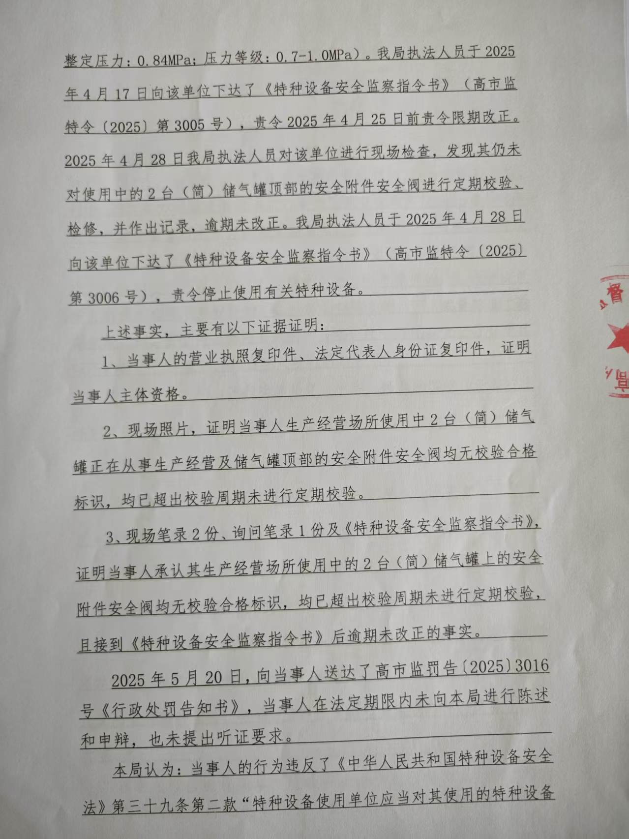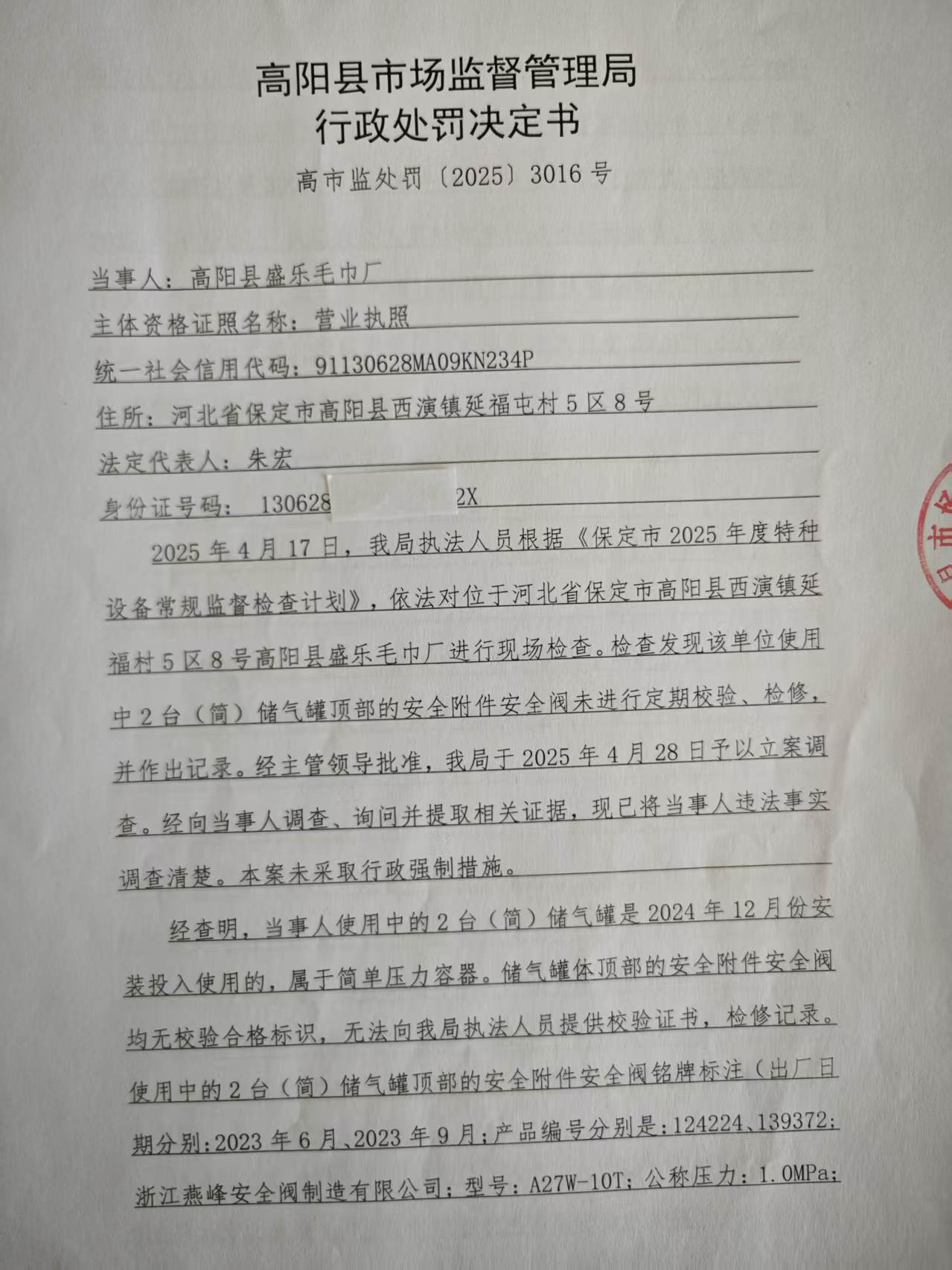 高阳县盛乐毛巾厂未对使用的特种设备的安全附件进行定期校验案