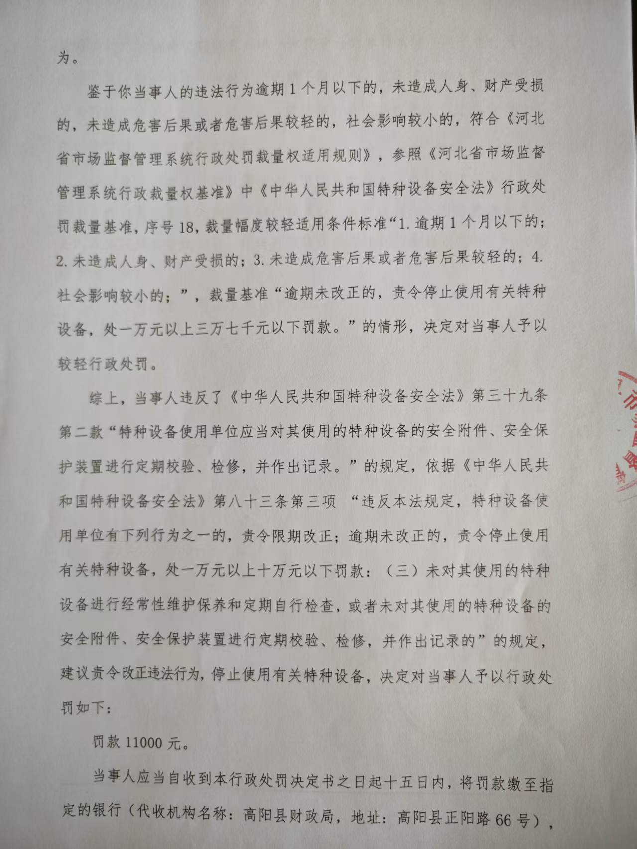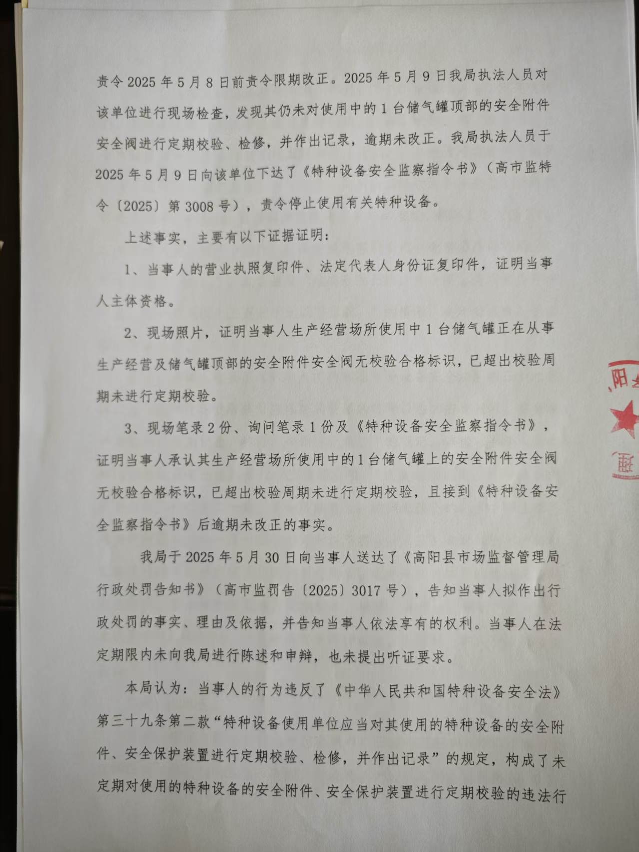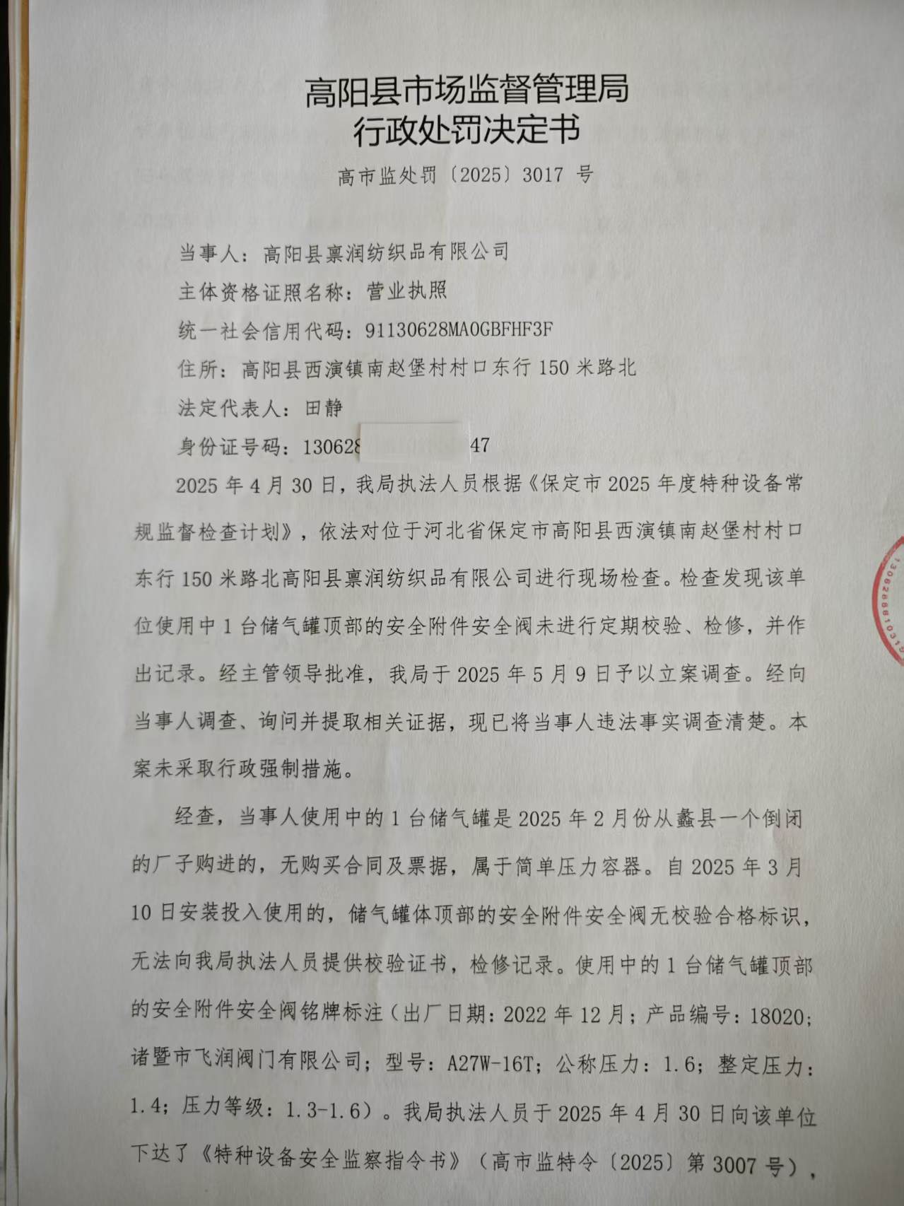 高阳县禀润纺织品有限公司未对使用的特种设备的安全附件进行定期校验案
