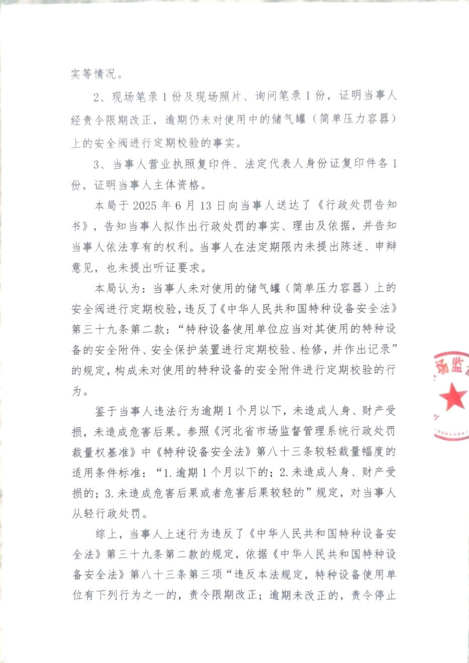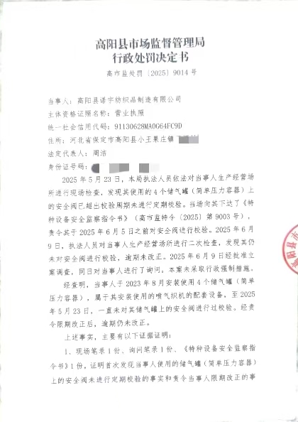 高阳县诺宇纺织品制造有限公司未对 使用的特种设备的安全附件进行定期校验案