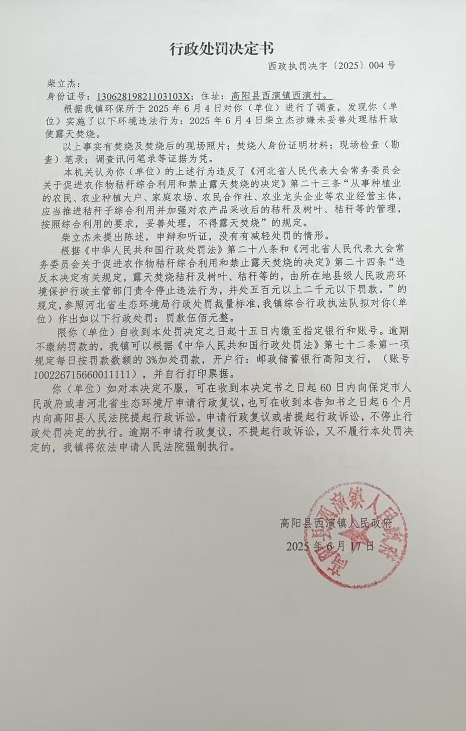 《行政处罚决定书》西政执罚决字〔2025〕004号